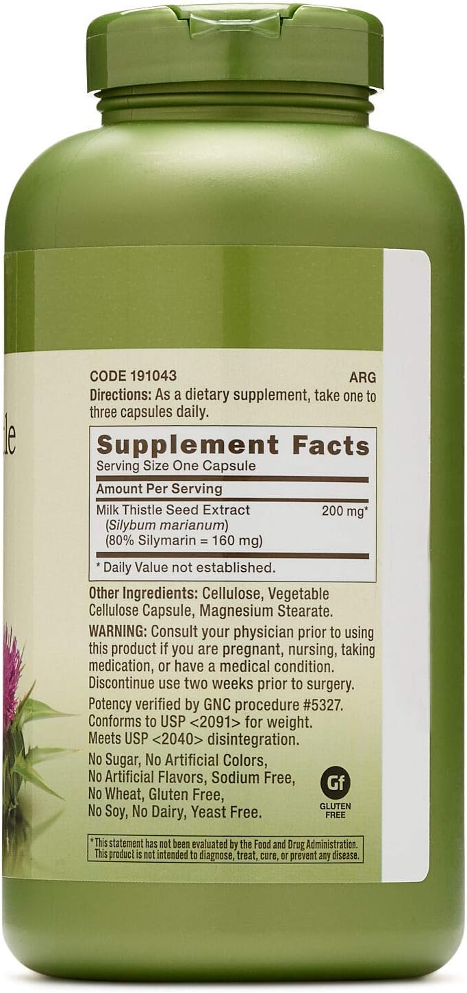 About this item Provides 200mg milk thistle seed extract SUPERIOR QUALITY: Vegetarian, gluten free, no soy, no wheat, no sodium, no dairy, no yeast, no artificial colors, no artificial flavors, no sugar. TRADITIONAL HERB: Utilized for centuries to support a variety of conditions. HERBAL SUPPLEMENT: Support liver health with traditional herbs used as detox supplements for centuries and powered by nature. BACKED BY SCIENCE: Since 1935, GNC has been committed to meeting the highest standards of quality, safety, and efficacy while applying the most up-to-date advances in nutritional science so you can live well. These statements have not been evaluated by the Food and Drug Administration. This product is not intended to diagnose, treat, cure, or prevent any disease. See more product details,Provides 200mg milk thistle seed extract,SUPERIOR QUALITY: Vegetarian, gluten free, no soy, no wheat, no sodium, no dairy, no yeast, no artificial colors, no artificial flavors, no sugar,TRADITIONAL HERB: Utilized for centuries to support a variety of conditions,HERBAL SUPPLEMENT: Support liver health with traditional herbs used as detox supplements for centuries and powered by nature,BACKED BY SCIENCE: Since 1935, GNC has been committed to meeting the highest standards of quality, safety, and efficacy while applying the most up-to-date advances in nutritional science so you can live well. These statements have not been evaluated by the Food and Drug Administration. This product is not intended to diagnose, treat, cure, or prevent any disease