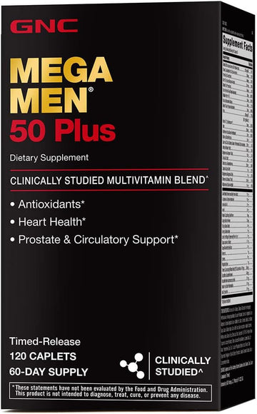 Gnc Mega Men 50 Plus Multivitamin: Antioxidants, Heart Health, And Prostate & Circulatory Support Achieve Your Daily Nutritional Goals With A Multivitamin That Has More Than 30 Clinically Studied Ingredients. Men'S Health - Contains A Clinically Studied Multivitamin Blend Shown To Work Better Than A Basic Multivitamin .^ Helps Support Prostate Health