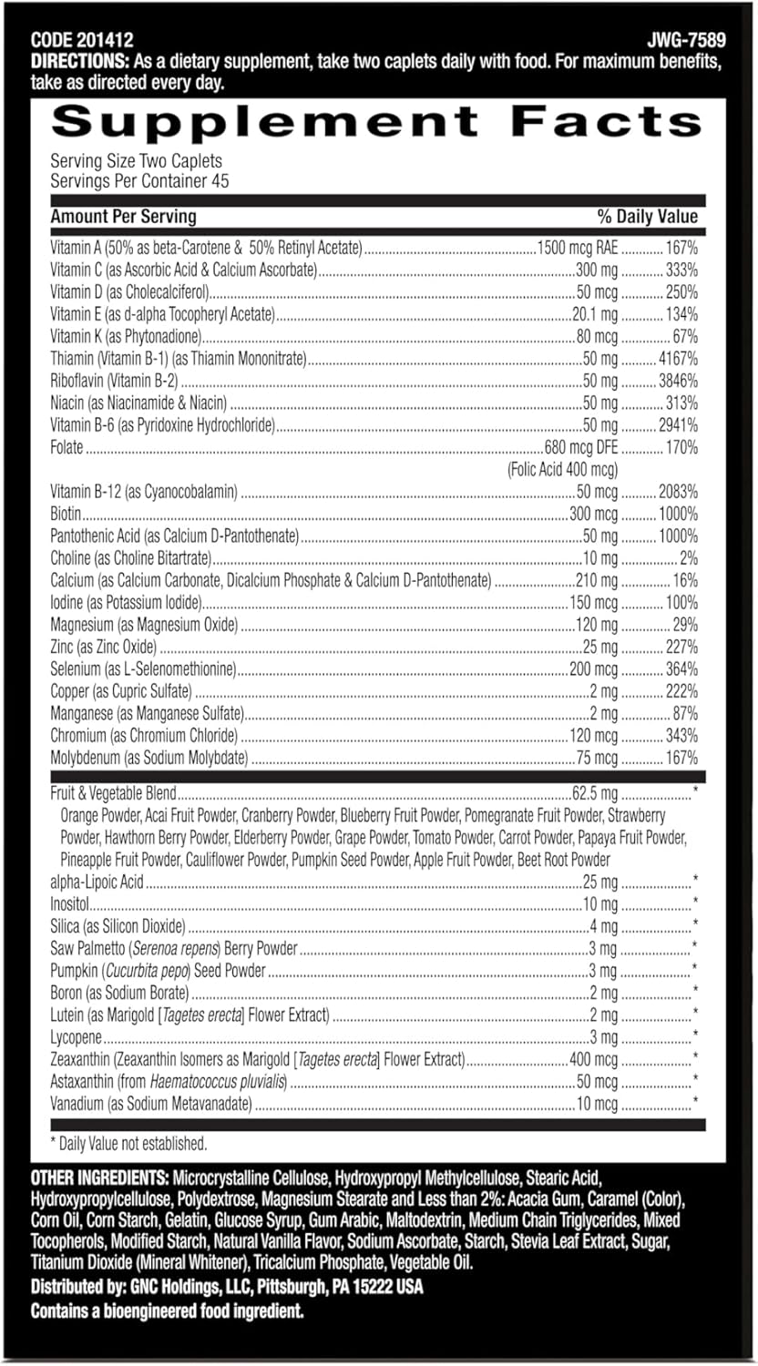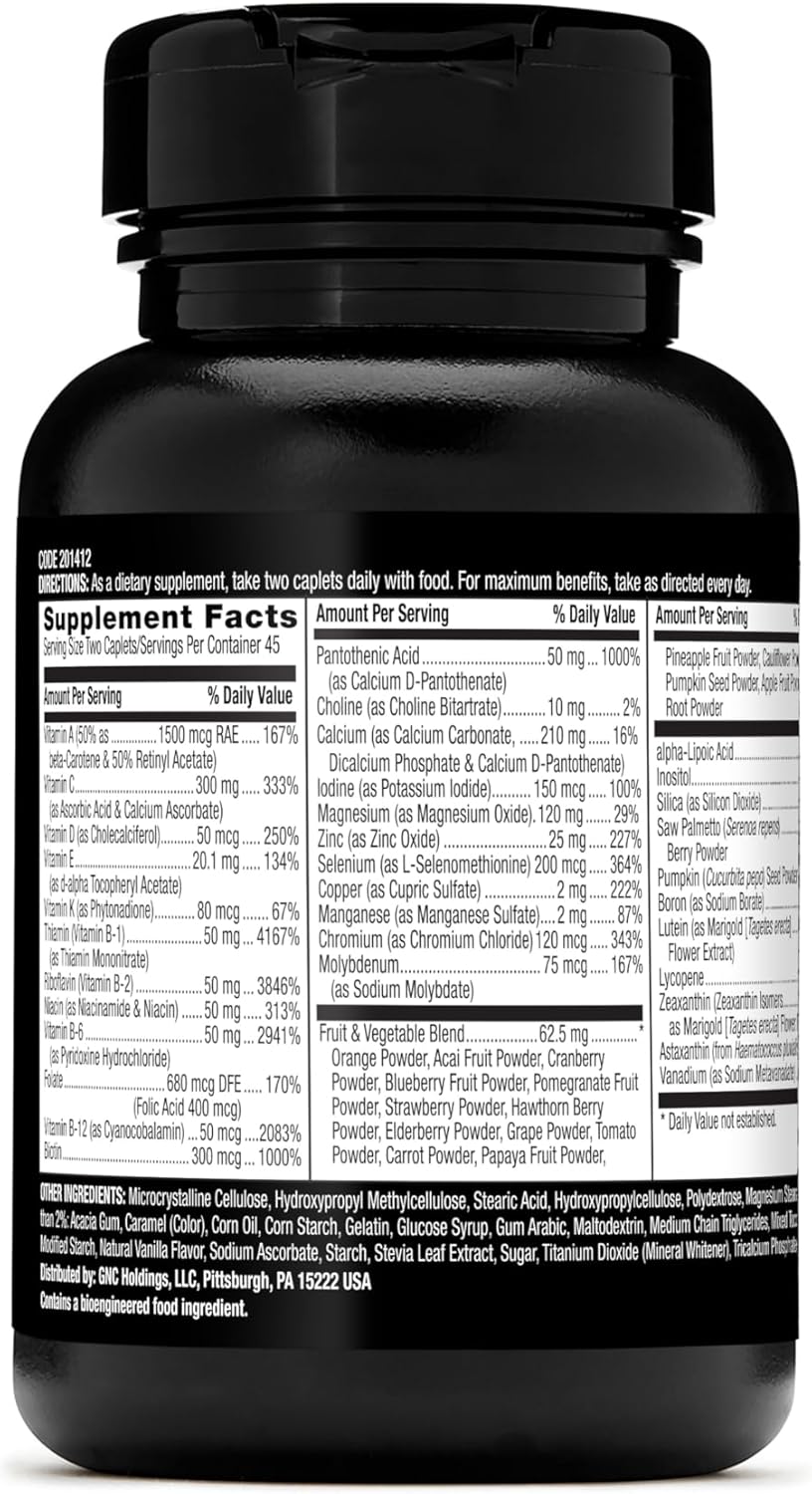 A clinically studied, premium multivitamin for men to supplement key nutrients missing in their daily diet,Clinically Proven Multivitamin Blend: Clinically proven to work better than a basic multi at boosting levels of key nutrients that support energy production and immune health. GNC's high-potency multivitamin blend is clinically shown to help you feel better, more rejuvenated, and absorb key nutrients,Complete Nutrient Support: This high-potency multivitamin features 18 vitamins and minerals at 100% daily value or more plus lycopene, saw palmetto, and pumpkin seed to support men’s prostate health,Immune Support: Bolsters immune health with 20% more absorption of key immune and stress defense nutrients,Energy Support: Features high-potency B vitamins that support energy production and the metabolism of carbohydrates, fats, and protein,Quality You Can Trust: Timed-release, Gluten free, No artificial flavors, No milk