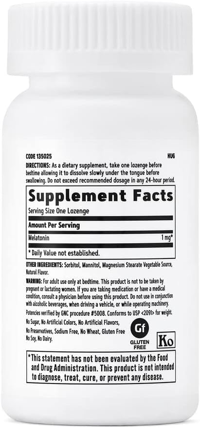 GNC Melatonin 1mg - Cherry, 120 Lozenges, Supports Restful Sleep MELATONIN 1M CHERRY LOZENGES – Delicious tasting, GNC Melatonin 1mg Cherry lozenges help promote sleep. REST EASY: Melatonin is a hormone your body can produce, making it easier for you to fall and remain asleep. NO PILLS: Lozenge dissolves slowly. FREE FROM WHAT YOU DON’T WANT: No Sugar, No Artificial Colors, No Artificial Flavors, No Preservatives, Sodium Free, No Wheat, Gluten Free, No Soy, No Dairy. BACKED BY SCIENCE: Since 1935, GNC has been committed to meeting the highest standards of quality, safety, and efficacy while applying the most up-to-date advances in nutritional science so you can live well. These statements have not been evaluated by the Food and Drug Administration. This product is not intended to diagnose, treat, cure, or prevent any disease. These statements have not been evaluated by the Food & Drug Administration. This product is not intended to diagnose, treat, cure, or prevent any disease