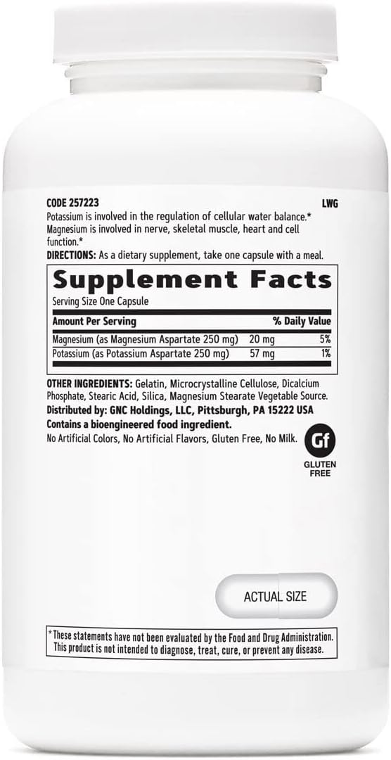 Gnc Potassium & Magnesium Aspartate - 240 Capsules Potassium & Magnesium Aspartate: Features 20Mg Of Magnesium And 57Mg Of Potassium Per Serving To Help Regulate Water Balance And Necessary Muscle Cell Contraction. Water Balance: Potassium Is Involved In The Regulation Of Cellular Water Balance. Nerve & Muscle Function: Magnesium Is Involved In Nerve, Skeletal Muscle, Heart, And Cell Function. Backed By Science: Since 1935, Gnc Has Been Committed To Meeting The Highest Standards Of Quality, Safety, And Efficacy While Applying The Most Up-To-Date Advances In Nutritional Science So You Can Live Well. These Statements Have Not Been Evaluated By The Food And Drug Administration. This Product Is Not Intended To Diagnose, Treat, Cure, Or Prevent Any Disease. These Statements Have Not Been Evaluated By The Food & Drug Administration. This Product Is Not Intended To Diagnose, Treat, Cure, Or Prevent Any Disease