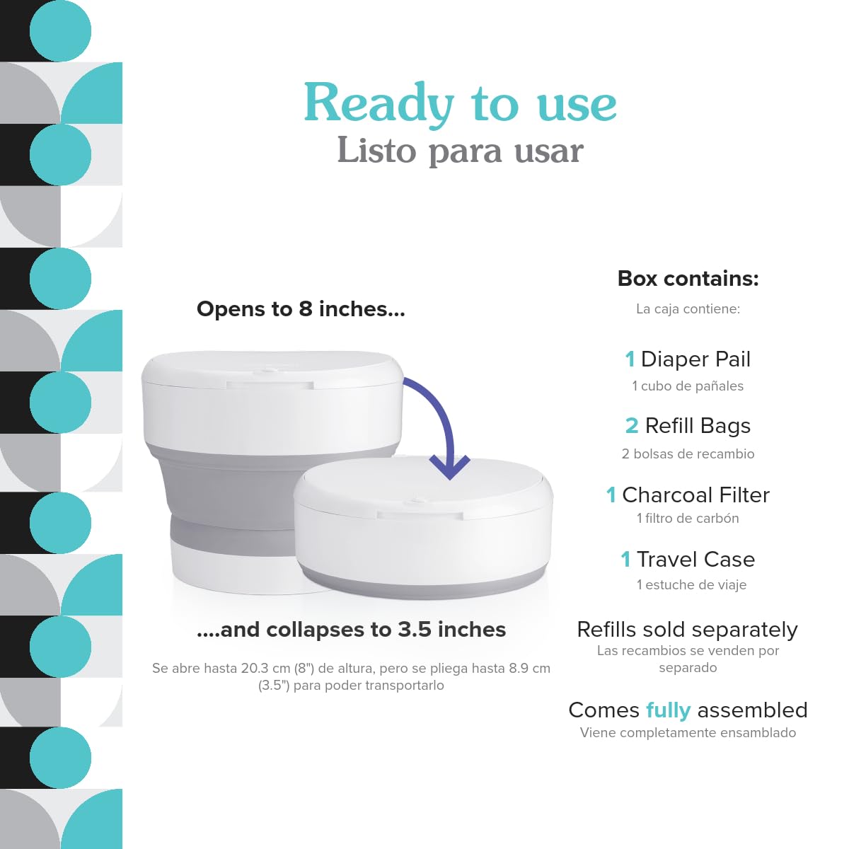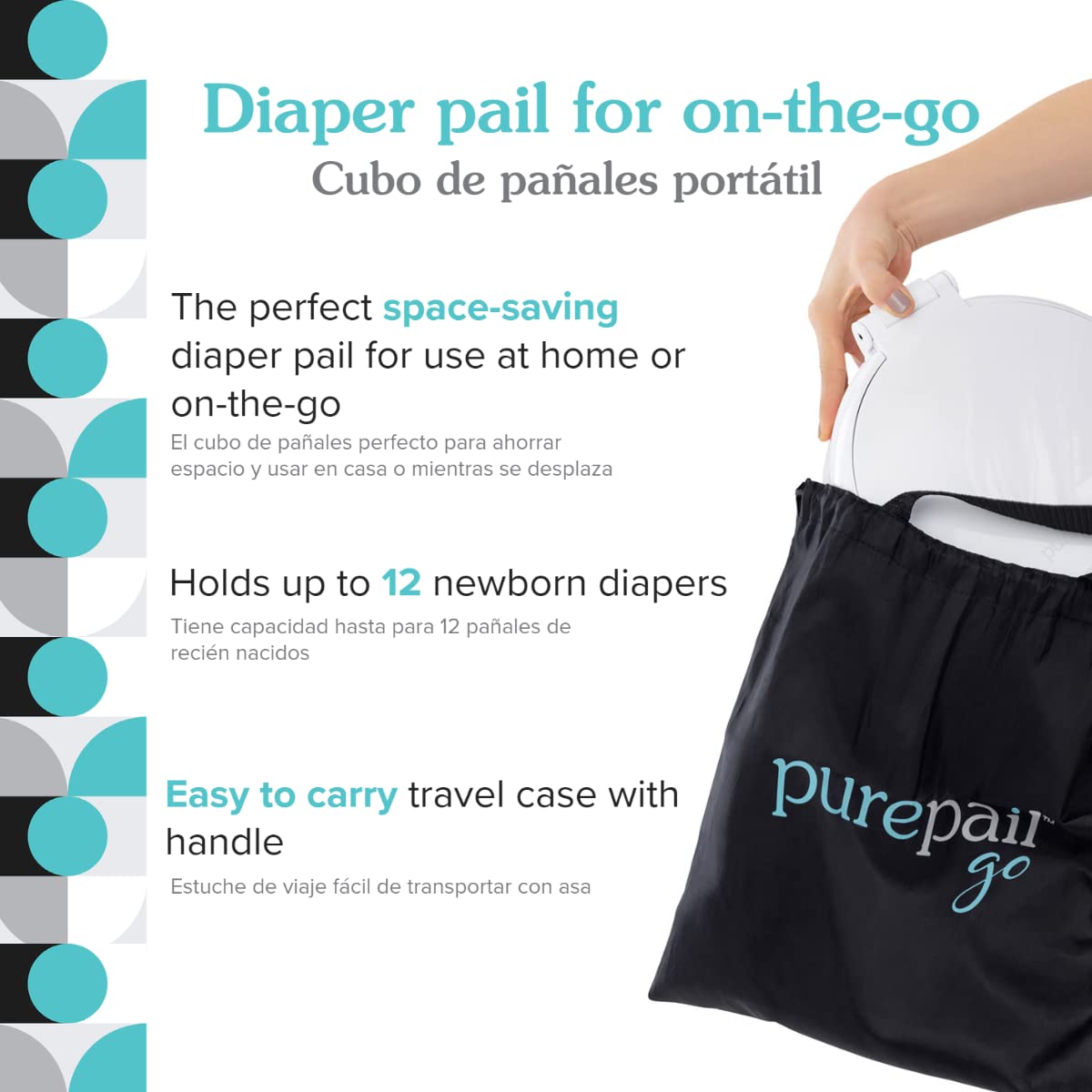 DIAPER PAIL FOR ON-THE-GO: The PurePail Go Portable Diaper Pail provides odor containment you can rely on wherever you are. Opens to 8” tall, yet folds down to 3.5” for portability (20.3 cm, 8.9 cm). Holds up to 12 newborn diapers. The perfect space-saving diaper pail for use at home or on-the-go. Easy to carry travel case with handle10SUPERIOR ODOR CONTROL: Uses the same odor-blocking technology as PurePail Classic — proven #1 in odor control without the use of added fragrance in independent testing. Bags remain sealed while the lid is open to prevent escaping odor. Charcoal filter absorbs odors without added fragrance10SAFE AND EASY TO USE: Lid opens with one tap. Child safety lock protects little fingers and keeps curious little hands out. No special mechanisms or complicated parts. Delightfully simple10MADE OF POLYPROPYLENE: BPA free. Won’t absorb odors. Can be cleaned and sanitized with household cleaners. And recyclable!10READY TO USE: Comes fully assembled. Includes 1 Go Portable Diaper Pail + 2 Refill Bags + 1 Charcoal Filter + 1 Travel Case. Refills sold separately