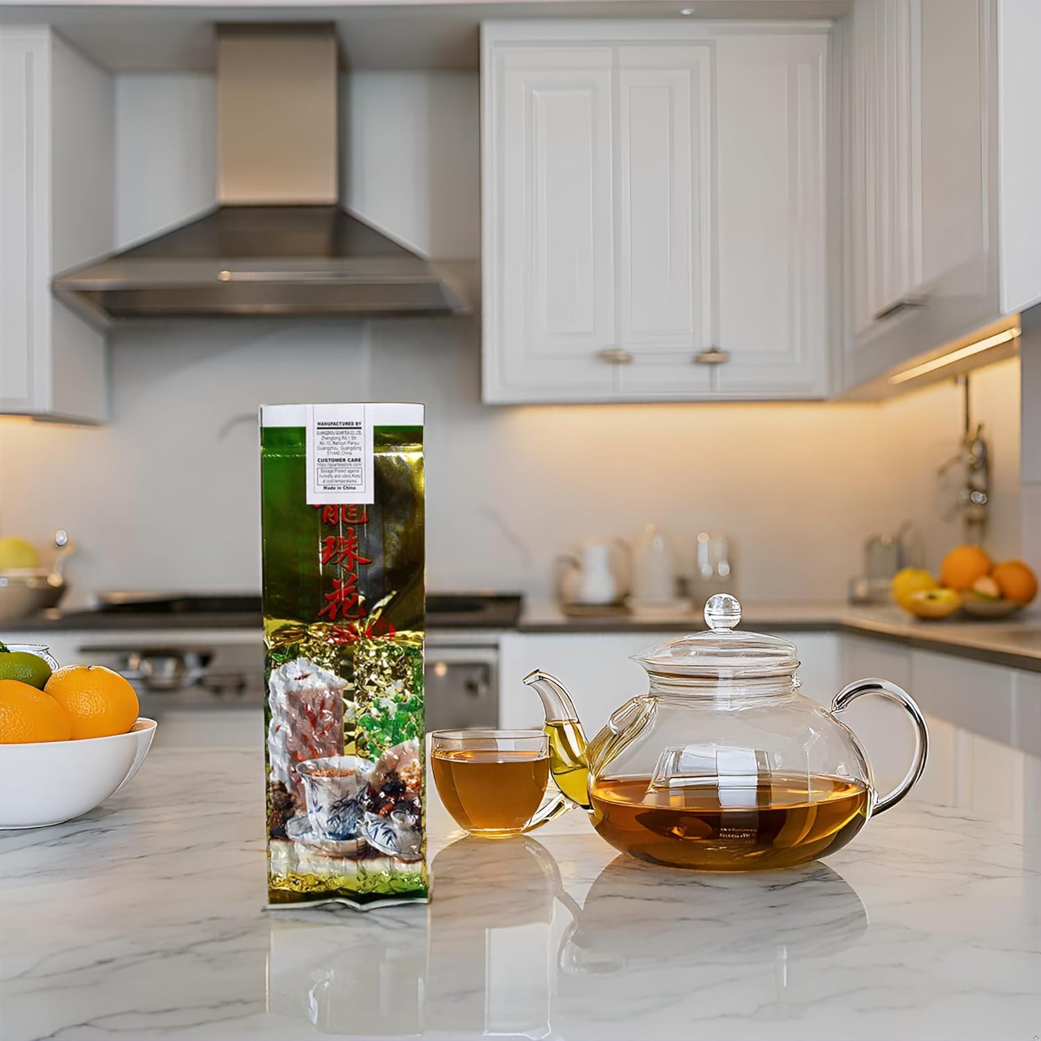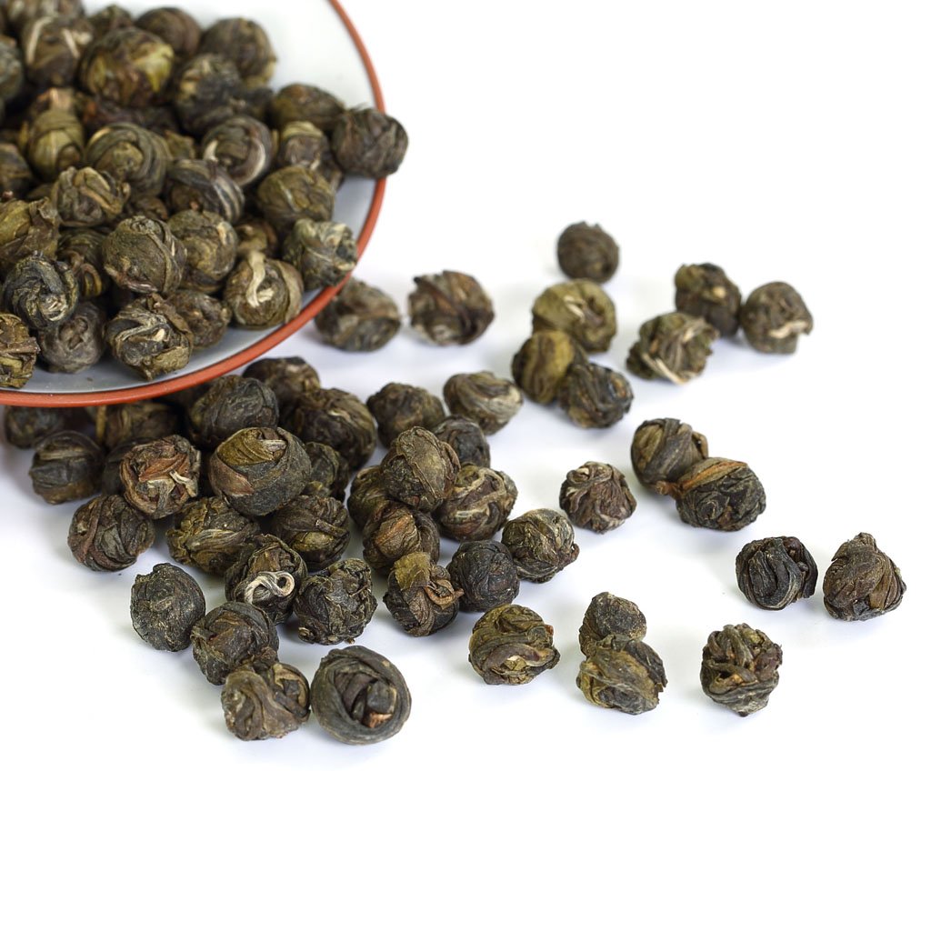 Features: Jasmine Dragon Pearls Is From Fujian Province Has A Sweet Aromatic Flavor With Bright Floral Notes, Which Contains The Jasmine Flower Scenting Process And Ball-Rolling Process. It Has The Lovely, Subtle Jasmine Aroma, But Also Tea Taste As Well