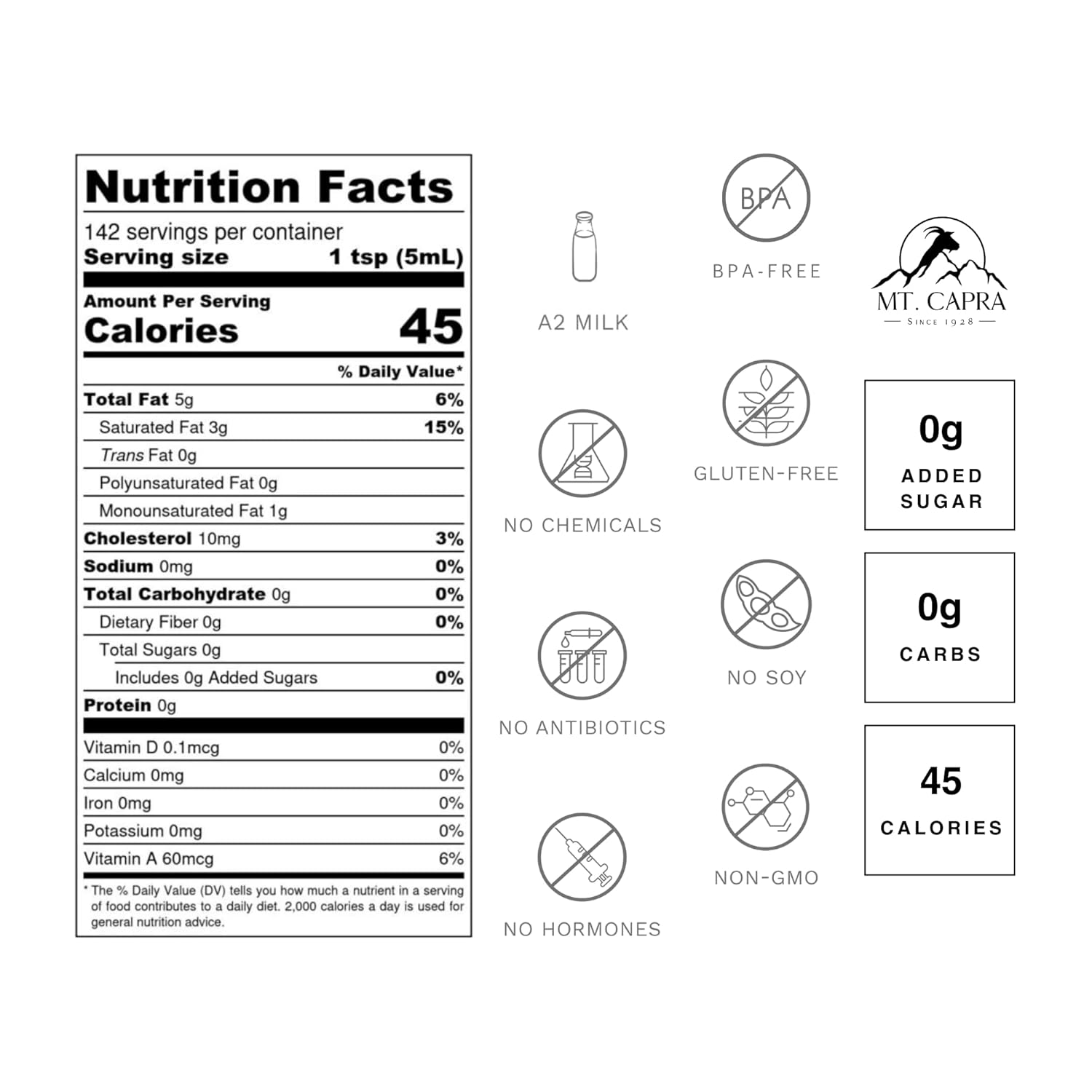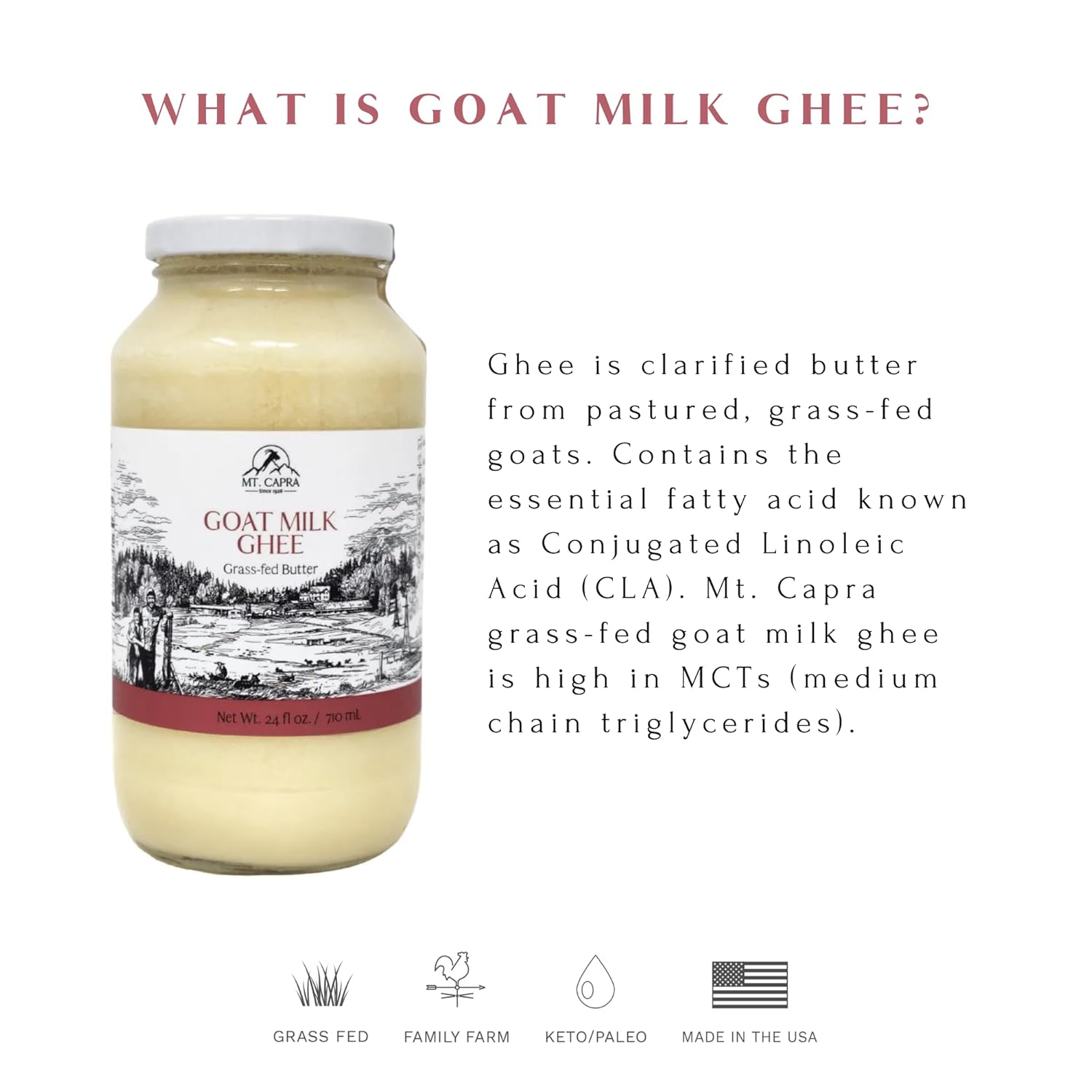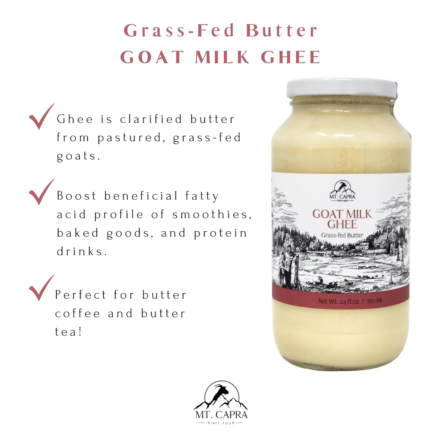 About this item Rich in Beneficial Fats: Contains naturally occurring MCTs and CLA to support energy, overall wellness, and provide essential fatty acids. Versatile Cooking Companion: With a high smoke point of 485°F, it's ideal for sautéing, baking, or adding to beverages like coffee and tea for a creamy texture. Shelf-stable and does not require refrigeration, offering convenience and longevity. Easy to Digest: Made from goat milk, which is often gentler on the digestive system compared to cow-derived products. ? Ideal for Various Dietary Needs: Suitable for those seeking a low-allergy alternative to cow or soy milk products. ? Grass-Fed and Sustainably Sourced: Produced by a family-run farm in the Pacific Northwest, emphasizing quality and environmental responsibility. › See more product details,Rich in Beneficial Fats: Contains naturally occurring MCTs and CLA to support energy, overall wellness, and provide essential fatty acids,Versatile Cooking Companion: With a high smoke point of 485°F, it's ideal for sautéing, baking, or adding to beverages like coffee and tea for a creamy texture. Shelf-stable and does not require refrigeration, offering convenience and longevity,Easy to Digest: Made from goat milk, which is often gentler on the digestive system compared to cow-derived products. ?,Ideal for Various Dietary Needs: Suitable for those seeking a low-allergy alternative to cow or soy milk products. ?,Grass-Fed and Sustainably Sourced: Produced by a family-run farm in the Pacific Northwest, emphasizing quality and environmental responsibility