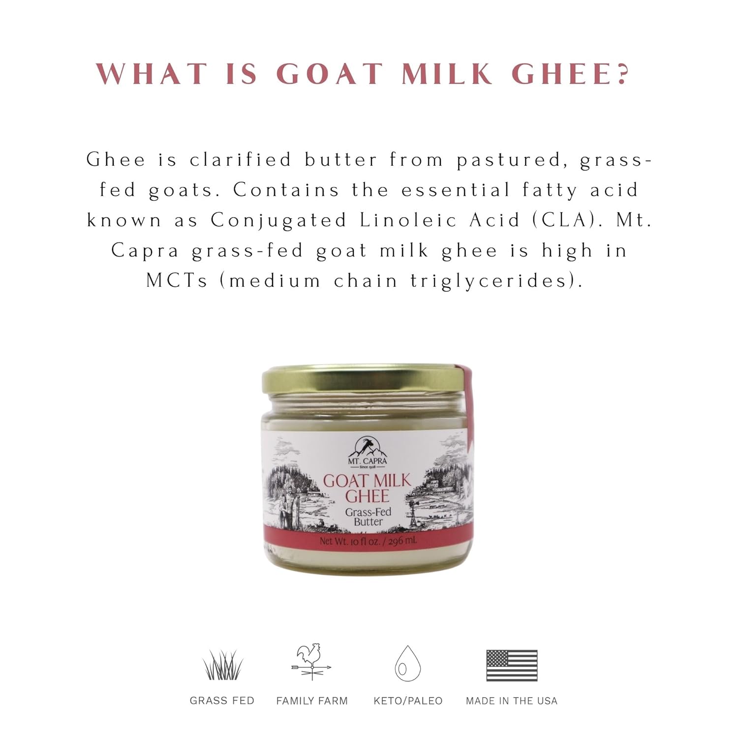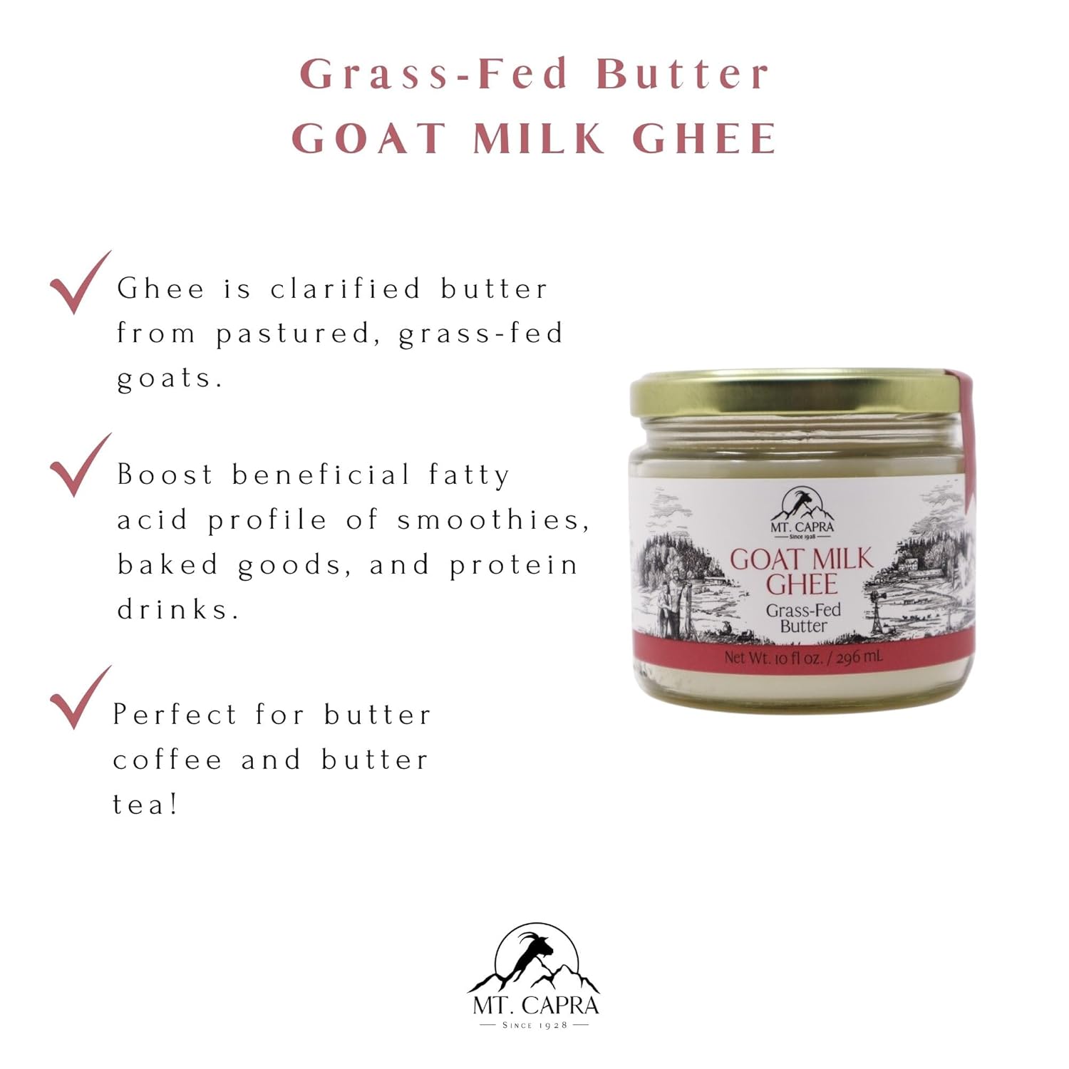 About this item Rich in Beneficial Fats: Contains naturally occurring MCTs and CLA to support energy, overall wellness, and provide essential fatty acids. Versatile Cooking Companion: With a high smoke point of 485°F, it's ideal for sautéing, baking, or adding to beverages like coffee and tea for a creamy texture. Shelf-stable and does not require refrigeration, offering convenience and longevity. Easy to Digest: Made from goat milk, which is often gentler on the digestive system compared to cow-derived products. ? Ideal for Various Dietary Needs: Suitable for those seeking a low-allergy alternative to cow or soy milk products. ? Grass-Fed and Sustainably Sourced: Produced by a family-run farm in the Pacific Northwest, emphasizing quality and environmental responsibility. › See more product details,Rich in Beneficial Fats: Contains naturally occurring MCTs and CLA to support energy, overall wellness, and provide essential fatty acids,Versatile Cooking Companion: With a high smoke point of 485°F, it's ideal for sautéing, baking, or adding to beverages like coffee and tea for a creamy texture. Shelf-stable and does not require refrigeration, offering convenience and longevity,Easy to Digest: Made from goat milk, which is often gentler on the digestive system compared to cow-derived products. ?,Ideal for Various Dietary Needs: Suitable for those seeking a low-allergy alternative to cow or soy milk products. ?,Grass-Fed and Sustainably Sourced: Produced by a family-run farm in the Pacific Northwest, emphasizing quality and environmental responsibility