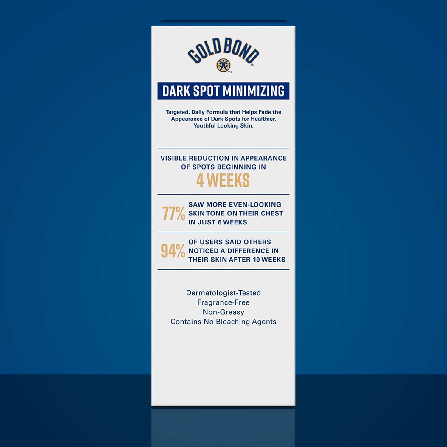 The appearance of dark spots can age the look of your hands, arms, neck, and chest. Gold Bond Dark Spot Minimizing Body Cream is a clinically tested formula that's designed to help reduce the appearance of dark spots. In fact, most users saw visible reduction in appearance of spots beginning in 4 weeks. Gold Bond Dark Spot Minimizing Body Cream is hypoallergenic, and doesn't contain bleaching agents or fragrance, making it gentle enough for daily use when used as directed. Use this gentle exfoliating body cream to improve the appearance of dark spots and give your skin a more youthful-looking appearance,Includes one (1) 2-ounce tube of Gold Bond Dark Spot Minimizing Age Renew Cream,Targeted daily formula that helps fade the appearance of dark spots for healthier, youthful skin,This Gold Bond cream for aging skin contains vitamin C to visibly brighten skin,Gold Bond Age Renew Dark Spot Minimizing Cream contains no bleaching agents,This dark spot minimizing cream is clinically tested, dermatologist tested and is suitable for sensitive skin,Create a TerraCycle account and start recycling your empty Gold Bond packaging