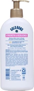 Strong skin is beautiful skin. Rejuvenate yours with Gold Bond Strength & Resilience Skin Therapy Lotion with proteins and lipids. Its unique formula has a blend of vital nutrients to help replenish moisture that is naturally lost from skin through the aging process. The seven moisturizers, stress response proteins, and lipids lock in moisture and nourish skin while the skin-firming complex of ingredients enhances skin's moisture. In fact, 87% of users reported visibly firmer skin in two weeks. What's more, Gold Bond Strength & Resilience Lotion is clinically-tested, hypoallergenic, fragrance-free, nongreasy, and fast-absorbing. DIRECTIONS: Apply daily to skin, reapplying as often as needed,Includes one (1) 13-oz. pump bottle of Gold Bond Strength & Resilience with proteins & lipids,Protein and lipid formula improves the texture of aging and mature skin,This unique complex of ingredients helps replenish and nourish skin,87% of people had visibly firmer skin in two weeks,This Gold Bond Strength & Resilience Lotion has been tested by dermatologists and is hypoallergenic,Create a TerraCycle account and start recycling your empty Gold Bond packaging