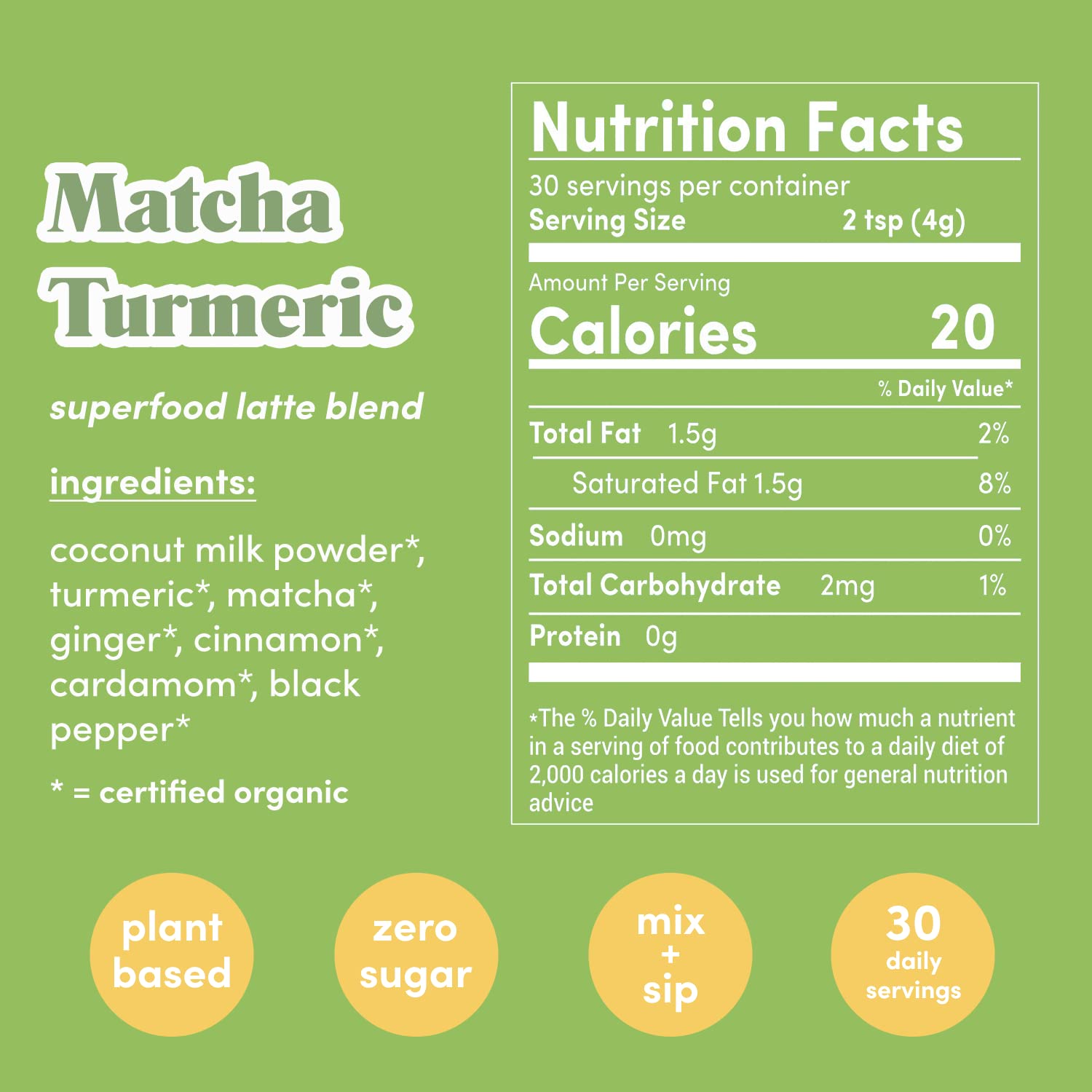 3 >THE PERFECT LATTE: Our Matcha Turmeric Latte is a warm, spiced blend with notes of mellow matcha green tea, cardamom, and cinnamon. The perfect boost for anytime of day – to start your day off right, or re-energize in the afternoon