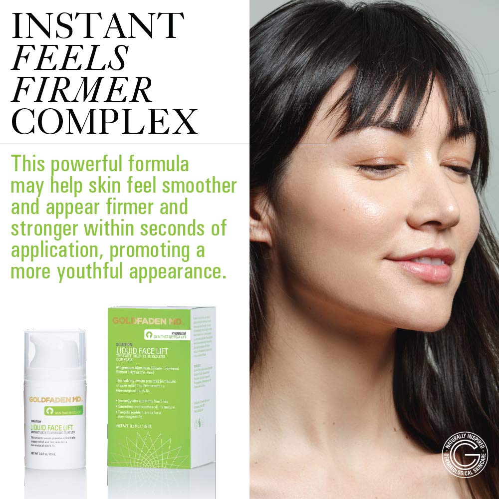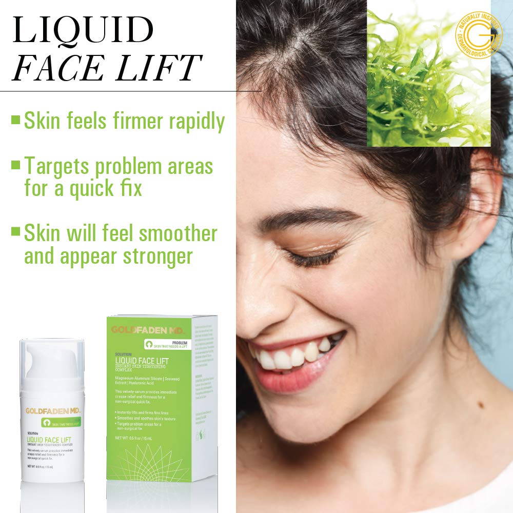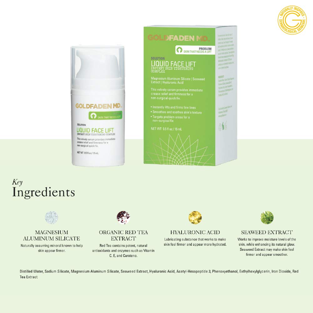Product Description GOLDFADEN MD Liquid Face Lift Rapidly Improve Feel of Skin Smoother Stronger and Firm 0.5 fl. oz. The Story of GOLDFADEN MD Plant powered, dermatologist developed, radiant results. Developed to mimic the radiant effects of the coveted in-office dermatologist procedures performed by Dr. Goldfaden by using natural, clean ingredients powered by plants,INSTANT FEELS FIRMER COMPLEX: This velvety serum provides rapid crease relief and makes skin feel firmer for a non-surgical quick x. Powerful antioxidants and skin firming ingredients work to target problem areas and reduce the appearance of fine lines and loose skin for skin that feels smoother and appears stronger. Hyaluronic Acid helps to plump the appearance of skin and may deliver moisture. This serum works within seconds of application promoting more youthful-looking skin,REDUCES THE LOOK OF FINE LINES AND CREASES: This concentrated serum is the ultimate non-invasive solution to reduce the appearance of fine lines appearing as crows feet, smile lines, brow crease on the face and neck. The high potency blend contains Pure Hyaluronic Acid and an advanced Hexapeptide that makes skin feel plump and appear firm. Nutrient-rich Seaweed Extract promotes a youthful-looking glow. With continued use, skin may look younger, feel smoother, and appear more radiant,PROFESSIONAL GRADE, NATURALLY INSPIRED: We are result focused & naturally conscience. Our products are formulated with Organic & Naturally derived Ingredients, are FREE of Parabens, harsh Chemicals, unstable Alcohols, harsh Mineral Oils, bad Silicones & are vegetarian, & not tested on animals. All packaging has been made with love & care from recyclable materials. We stand behind the quality of our products,SUITABLE FOR ALL SKIN TYPES: Effective yet gentle enough for sensitive, mature & aging skin types delivering results you can see & feel. Within approximately 7-10 days skin may feel softer, look smoother, appear plumper more hydrated. With regular use, after 4-6 weeks may reduce the appearance of fine lines, wrinkles, dark spots & marks, may appear more balanced, look more plump & feel more supple. Results may continue with regular use,DERMATOLOGIST DEVELOPED: Brand founder Dr. Gary Goldfaden has a love and passion for skincare, wellness and a healthy lifestyle. Inspired by his in-office experiences, Dr. Goldfaden develops innovative & technologically advanced skincare solutions that provide results, well-tolerated even by those with sensitive skin. These highly efficacious skincare solutions utilize state-of-the-art technologies with active plant cells and anti-oxidant rich botanicals