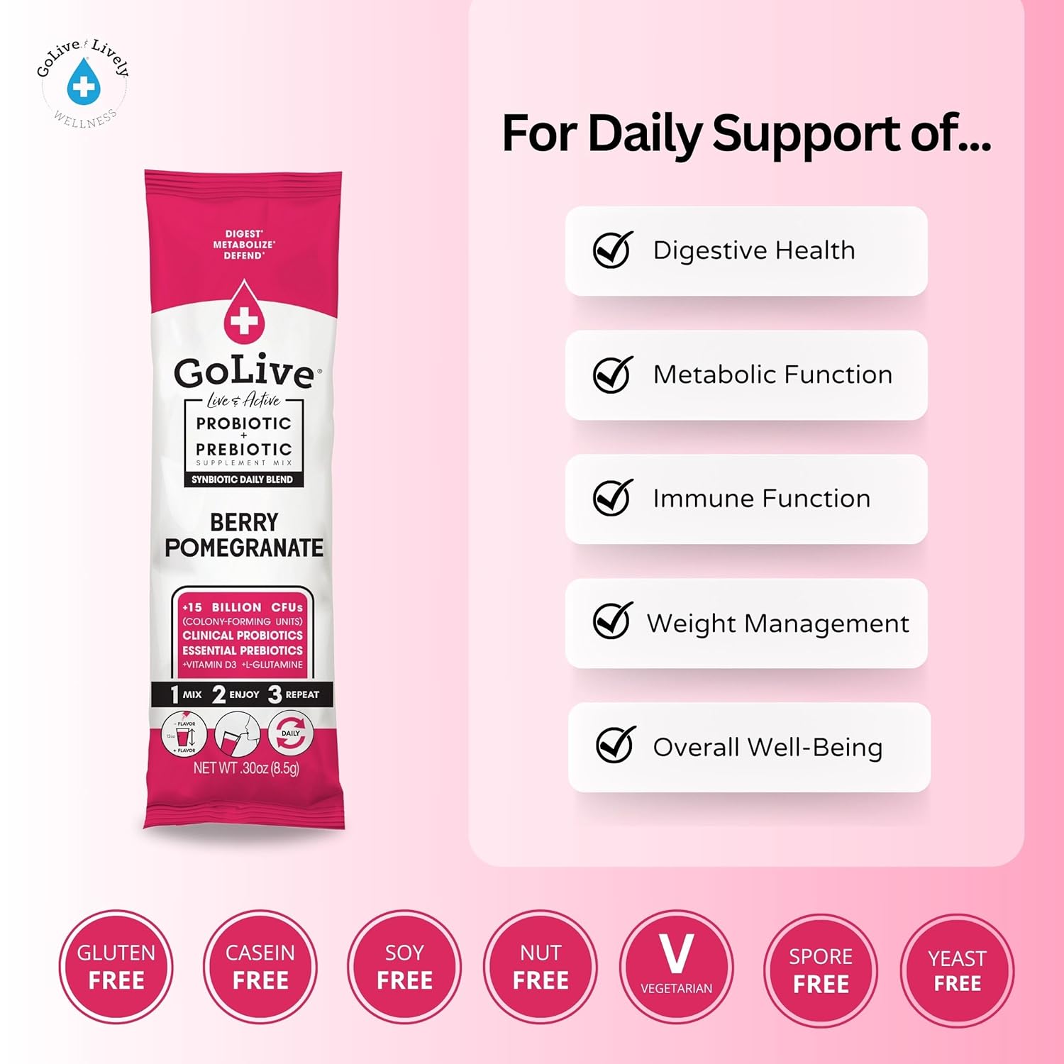 Golive Prebiotic And Probiotic For Women, Men, Kids. Berry Pomegranate Synbiotic Powder W/ L-Glutamine, Vitamin D3, Electrolytes. For Gut Health, Digestion, Metabolism, Immunity 15-50B Cfus