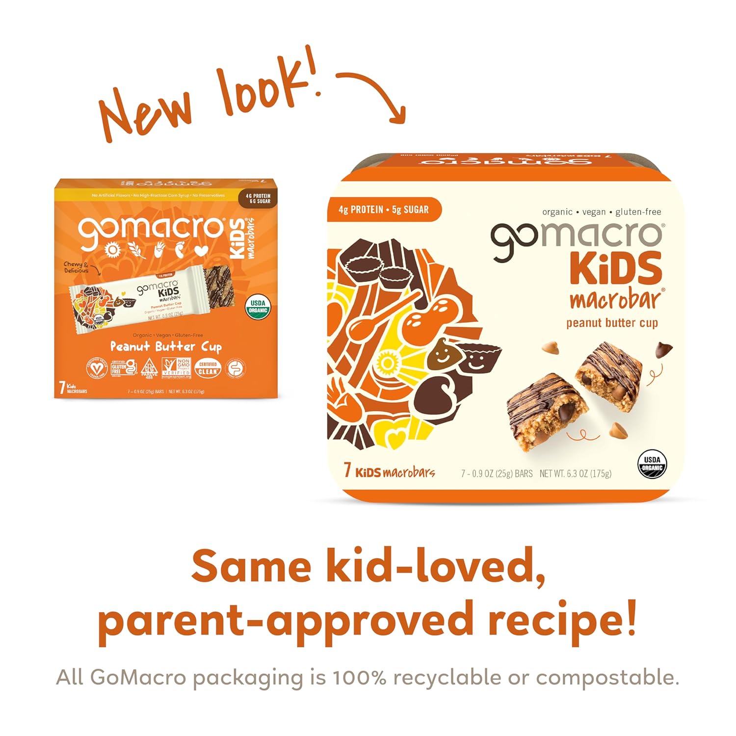 Wholesome Organic Peanut Butter + Vegan Chocolate Drizzle = The Ultimate Snack Time Victory With Peanut Butter Cup Kids Macrobars! We Combine Creamy Organic Peanut Butter, Vegan Chocolate Drizzle, Delicious Peanut Butter Chips, And 4 Grams Of Plant-Based Protein In Every Bar. Available In 5 Delicious Flavors, All Gomacro Kids Macrobars Are Certified Organic, Vegan, Gluten-Free, Kosher, Non-Gmo, C.L.E.A.N., Fodmap Friendly, And Soy-Free. Mother-Daughter Owned And Based In A Small Rural Community, Gomacro’S Mission Is To Spread Awareness For A Balanced, Plant-Based Lifestyle. Our Vegan Protein Bars Are Produced With 100% Renewable Energy, We’Re 100% Carbon Neutral, And We Continually Strive To Make A Positive Impact On The Planet. Product Details: (7) Organic Vegan Kids Bars Flavor: Peanut Butter Cup Size: 0.90 Ounce Bars, 7 Per Box Ingredients: Organic Brown Rice Syrup, Organic Peanut Butter, Organic Protein Blend (Organic Sprouted Brown Rice Protein, Organic Pea Protein), Organic Chocolate Chips (Organic Coconut Sugar, Organic Cocoa, Organic Cocoa Butter), Organic Puffed Brown Rice, Organic Peanut Butter Chips (Organic Peanut Flour, Organic Cocoa Butter, Organic Coconut Sugar, Salt), Organic Chocolate Drizzle (Organic Coconut Sugar, Organic Cocoa, Organic Cocoa Butter), Organic Natural Vanilla Flavor, Organic Maple Sugar, Sea Salt