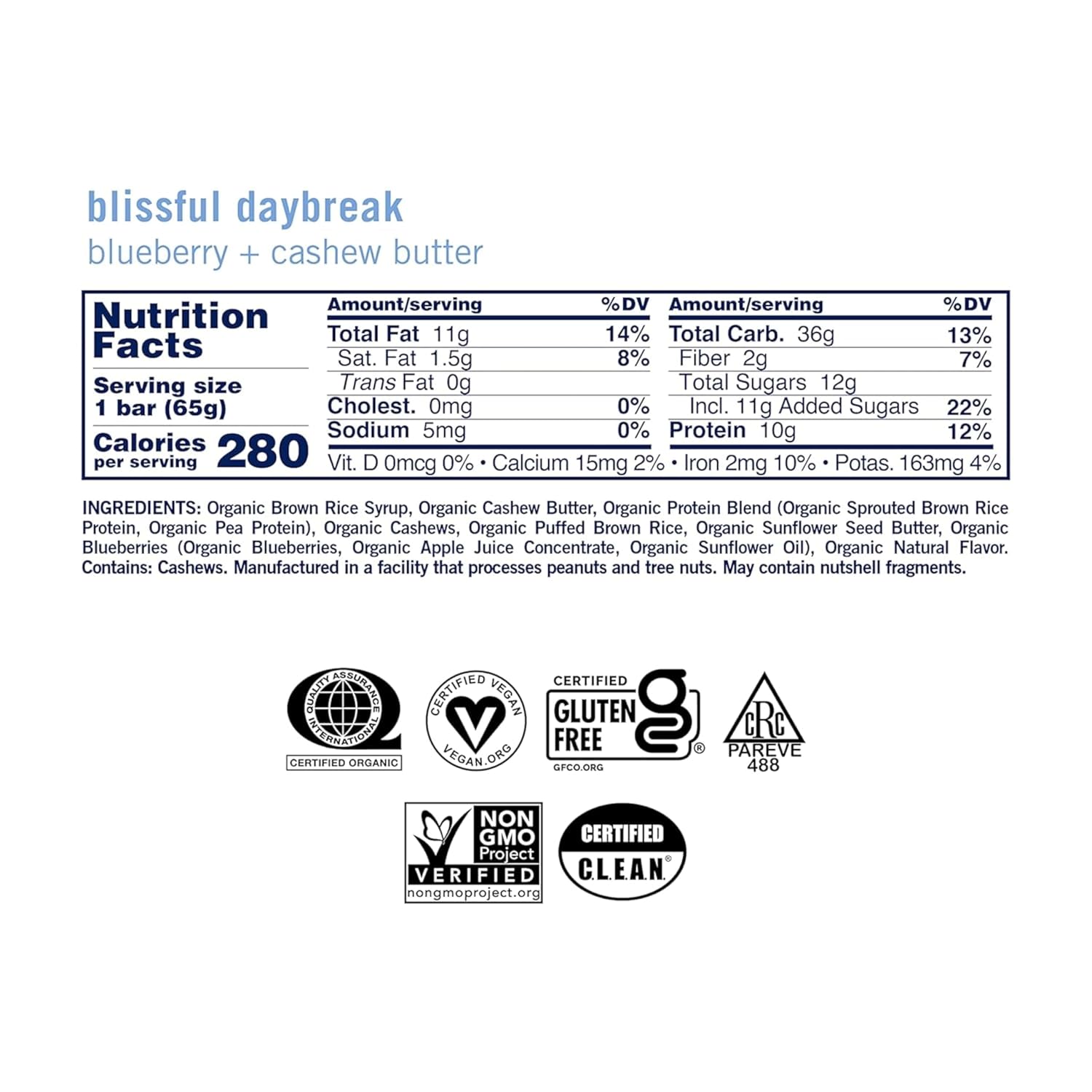 Our Blueberry + Cashew Butter Macrobar Is A Blend Of Organic Blueberries, Plant-Based Protein, And Creamy Cashew Butter That Provides A Boost Of Positive, Real Food Energy That Will Revitalize Your Spirit All Day Long. Like All Of Our Plant-Based Protein Bars, Blissful Daybreak Is Certified Organic, Vegan, Gluten-Free, Kosher, Non-Gmo, C.L.E.A.N., And Soy-Free. Mother-Daughter Owned And Based In A Small Rural Community, Gomacro’S Mission Is To Spread Awareness For A Balanced, Plant-Based Lifestyle. Our Vegan Protein Bars Are Produced With 100% Renewable Energy, We’Re 100% Carbon Neutral, And We Continually Strive To Make A Positive Impact On The Planet. It’S Our Goal To Inspire You To Have A Healthy Body, Sharp Mind, And Bold Spirit. Join Us As We Make The World Better, One Bite At A Time! Product Details: • (12) Organic Vegan Protein Bars • Flavor: Blueberry + Cashew Butter • Size: 2.4 Ounce Bars, 12 Per Tray Ingredients: Organic Brown Rice Syrup, Organic Cashew Butter, Organic Protein Blend (Organic Sprouted Brown Rice Protein, Organic Pea Protein), Organic Cashews, Organic Puffed Brown Rice, Organic Sunflower Seed Butter, Organic Blueberries (Organic Blueberries, Organic Apple Juice Concentrate, Organic Sunflower Oil), Organic Natural Flavor. Available In 16 Delicious Flavors