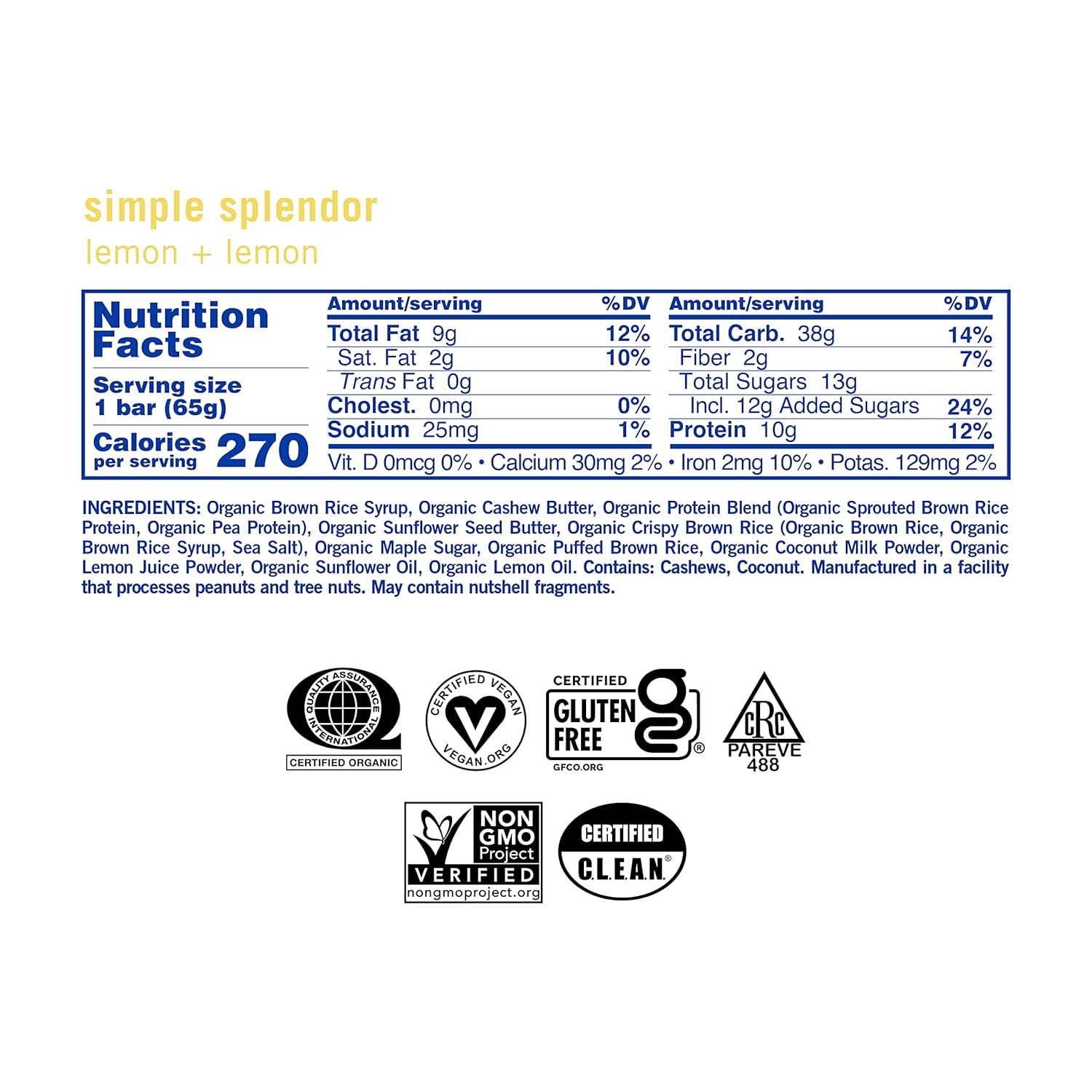 Like A Glass Of Freshly Squeezed Lemonade On A Sunny Day, Simple Splendor Is Bursting With The Brightness Of Organic Lemon, Crispy Puffed Brown Rice, And Rich Organic Cashew Butter. Made With 10G Of Plant-Based Protein And A Whole Lot Of Sunshine, Get Ready For A Snack That Elevates Your Day... Every Day!