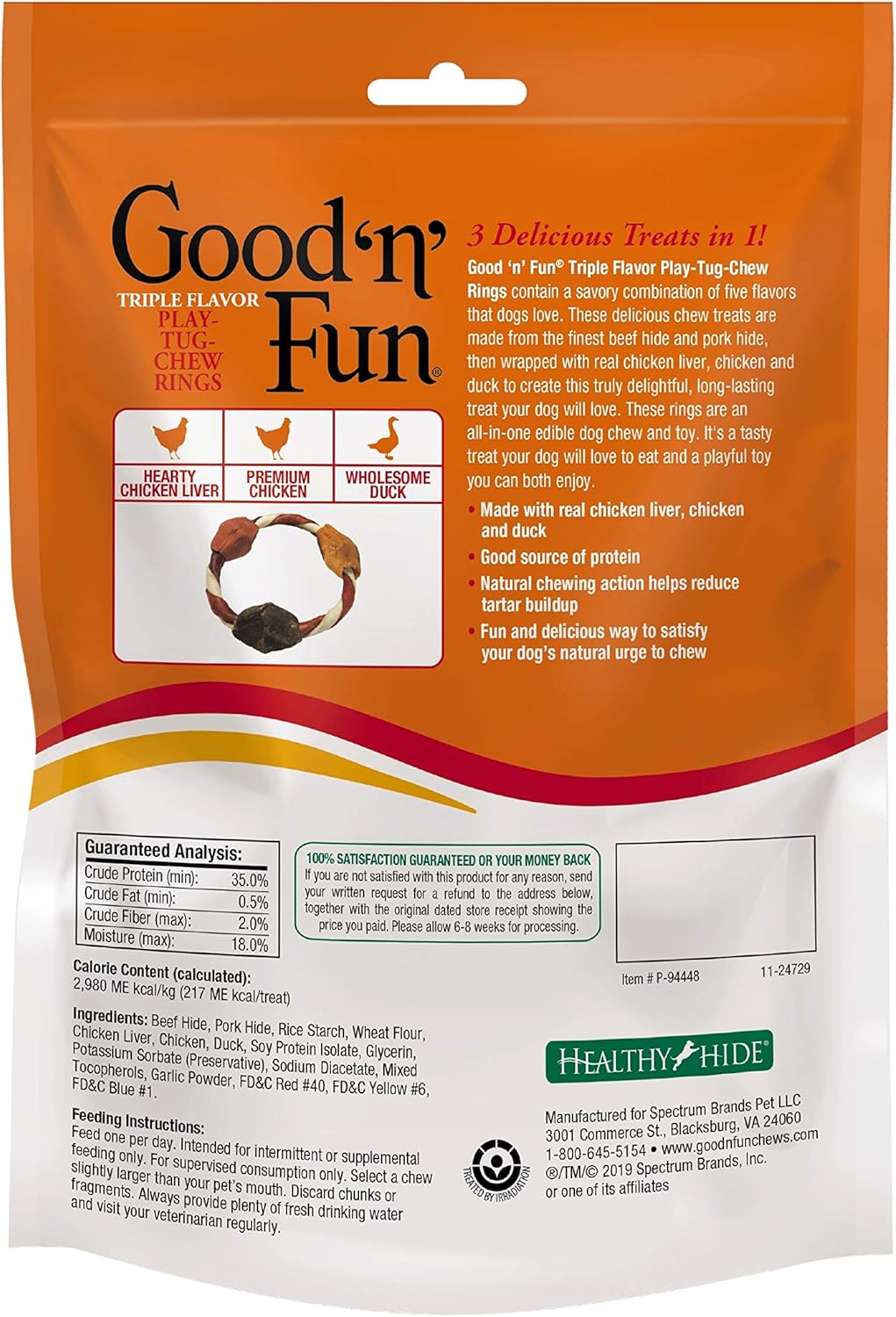 Good ‘N’ Fun Chews Offer A Tasty Variety Of Flavors That Dogs Love. These Delicious Chews Are Made From The Finest Ingredients, Including Beef Hide And Pork Hide, To Create Truly Delightful, Long-Lasting Treats Your Dog Will Love.Good ‘N’ Fun Triple Flavor Play-Tug-Chew Rings Contain A Savory Combination Of Five Flavors That Dogs Love. These Delicious Chew Treats Are Made From The Finest Beef Hide And Pork Hide, Then Wrapped With Real Chicken Liver, Chicken And Duck To Create This Truly Delightful, Long-Lasting Treat Your Dog Will Love. These Rings Are An All-In-One Edible Dog Chew And Toy. It’S A Tasty Treat Your Dog Will Love To Eat And A Playful Toy You Both Can Enjoy. Who Says You Can’T Play With Your Food A Good Source Of Protein, Good ‘N’ Fun Triple Flavor Play-Tug-Chew Rings Are A Fun And Delicious Way To Satisfy Your Dog’S Natural Urge To Chew. The Natural Action Of Chewing Also Helps Reduce Tartar Buildup And Plaque. These Gourmet Chews Make For Long-Lasting Entertainment And Are Appropriate For All Dog Sizes.Give Your Dog One Good ‘N’ Fun Triple Flavor Play-Tug-Chew Ring Per Day. Intended For Intermittent Or Supplemental Feeding Only. For Supervised Consumption Only. Select A Chew Slightly Larger Than Your Pet’S Mouth. Discard Chunks Or Fragments. Always Provide Plenty Of Fresh Drinking Water And Visit Your Veterinarian Regularly