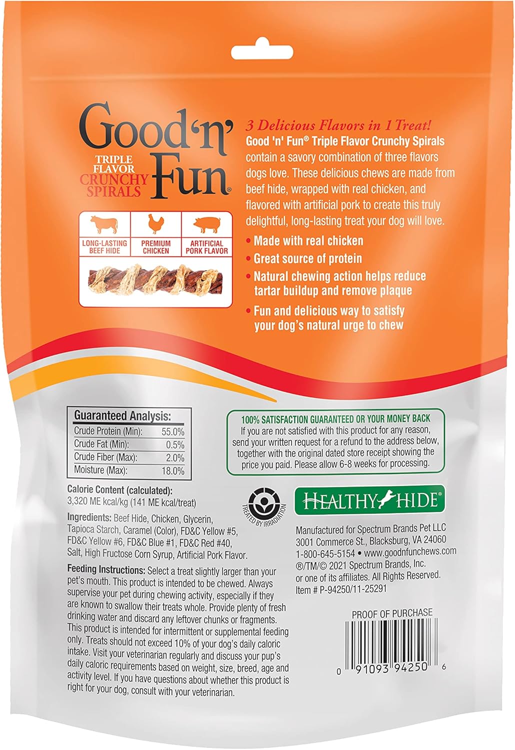 Good ‘N’ Fun Brand Contains A Savory Combination Of Flavor That Dogs Love Most. These Delicious Chew Treats Are Made From The Finest Ingredients, Including Delicious Beef Hide, To Create Truly Delightful, Long-Lasting Treats Your Dog Will Love. Good ‘N’ Fun Triple Flavor Crunchy Spirals Contain A Savory Combination Of Three Flavors Dogs Love. These Delicious Chews Are Made From Long-Lasting Beef Hide And Delicious Pork Hide, Then Wrapped With Real Chicken To Create This Truly Delightful, Long-Lasting Treat Your Dog Will Love. Made With Real Chicken, These Chews Are A Great Source Of Protein For Dogs Of All Sizes. Good ‘N’ Fun Triple Flavor Crunchy Spirals Are A Fun And Delicious Way To Satisfy Your Dog’S Natural Urge To Chew, While The Natural Chewing Action Helps Reduce Tartar Buildup And Remove Plaque. Feed 1 Chew To Your Dog Daily And Always Supervise Your Dog While Consuming