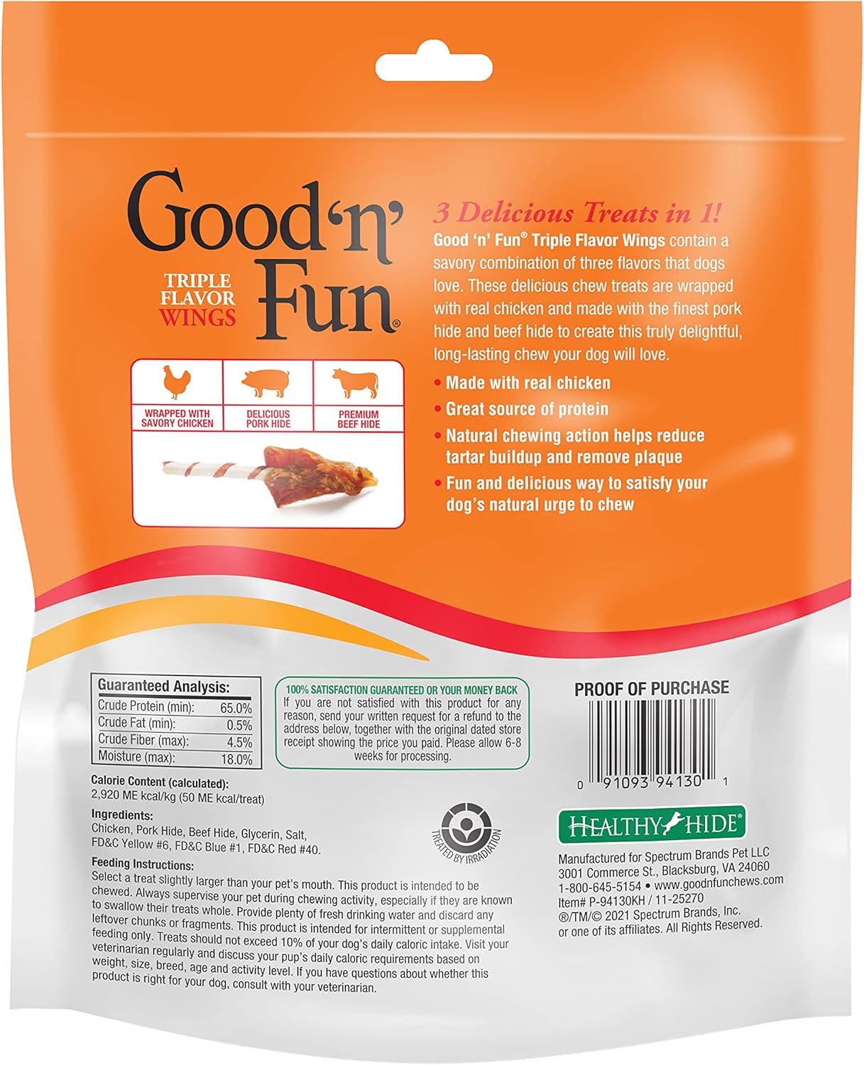 Good ‘N’ Fun Brand Contains A Savory Smorgasbord Of Flavors That Dogs Love Most. These Delicious Chew Treats Are Made From The Finest Ingredients, Including Premium Beef Hide And Real Chicken, To Create Truly Delightful, Long-Lasting Treats Your Dog Will Love. Good 'N' Fun Triple Flavor Wings Contain A Savory Combination Of Three Flavors That Dogs Love Most. These Delicious Chew Treats Are Made From The Finest Pork Hide And Rawhide, Then Wrapped With Real Chicken To Create This Truly Delightful Treat Your Dog Will Love. The Natural Chewing Action Helps Reduce Tartar Buildup, So There’S Something You Both Can Love. The Unique Wing Shape Packs On Flavor And Provides A Great Source Of Protein For Your Pup. Triple Flavor Wings Provide You With A Healthy And Delicious Way To Satisfy Your Dog'S Natural Urge To Chew. Snack For All Sized Dogs. Give One Per Day. Always Provide Plenty Of Fresh Drinking Water