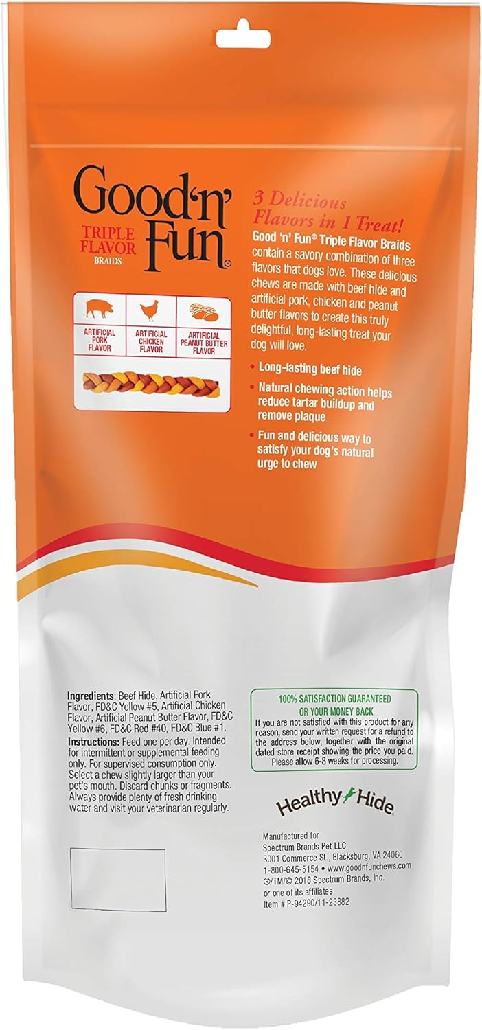Good ‘N’ Fun Brand Contains A Savory Combination Of Flavor That Dogs Love Most. These Delicious Chew Treats Are Made From The Finest Ingredients, Including Delicious Beef Hide, To Create Truly Delightful, Long-Lasting Treats Your Dog Will Love. Good ‘N’ Fun Triple Flavor Braids Contain A Savory Combination Of Three Flavors Dogs Love. These Delicious Chews Are Made From Long-Lasting Beef Hide And Artificial Pork, Chicken And Peanut Butter Flavors To Create This Truly Delightful, Long-Lasting Treat Your Dog Will Love. The Braided Shape Is Unique And Fun, Making It A Perfect Snack For Large-Size Dogs! Good ‘N’ Fun Triple Flavor Braids Are A Fun And Delicious Way To Satisfy Your Dog’S Natural Urge To Chew, While The Natural Chewing Action Helps Reduce Tartar Buildup And Remove Plaque. Feed 1 Chew To Your Dog Daily And Always Supervise Your Dog While Consuming