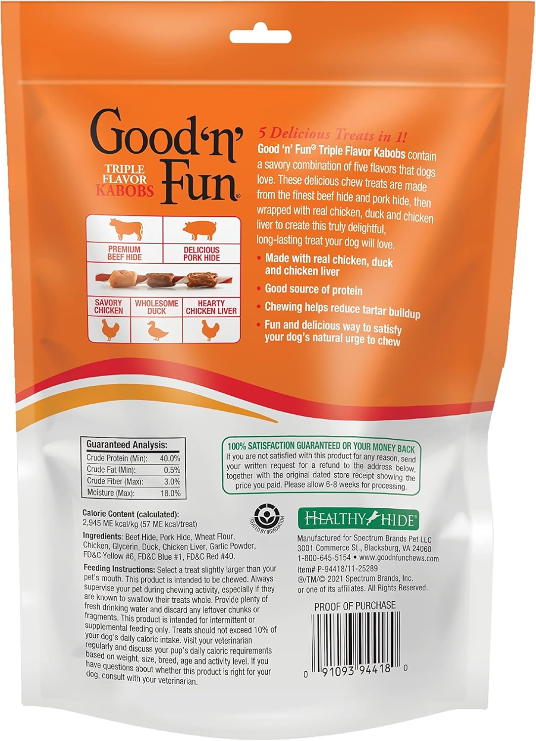 Good ‘N’ Fun Chews Offer A Tasty Variety Of Flavors That Dogs Love. These Delicious Chews Are Made From The Finest Ingredients, Including Real Beef Hide And Chicken, To Create Truly Delightful, Long-Lasting Treats Your Dog Will Love. Wrapped With Premium Cuts Of Real Chicken, These Flavor-Packed Good ‘N’ Fun Triple Flavor Kabobs Are Sure To Get Your Dog’S Tail Wagging. Plus, These Delicious Gourmet Dog Treats Are Made From The Finest Beef Hide And Pork Hide, Then Wrapped With Real Chicken, Wholesome Duck And Hearty Chicken Liver Flavor To Create A Truly Delightful, Long-Lasting Rawhide Treat Your Dog Will Love. A Good Source Of Protein, Good ‘N’ Fun Triple Flavor Kabobs Are A Fun And Delicious Way To Satisfy Your Dog’S Natural Urge To Chew. The Natural Action Of Chewing Also Helps Reduce Tartar Buildup. Give Your Dog One Good ‘N’ Fun Triple Flavor Kabob Chew Per Day. For Intermittent And Supplemental Feeding Only. For Supervised Consumption Only. Select A Chew Slightly Larger Than Your Pet’S Mouth. Discard Chunks Or Fragments. Always Provide Plenty Of Fresh Drinking Water And Visit Your Veterinarian Regularly