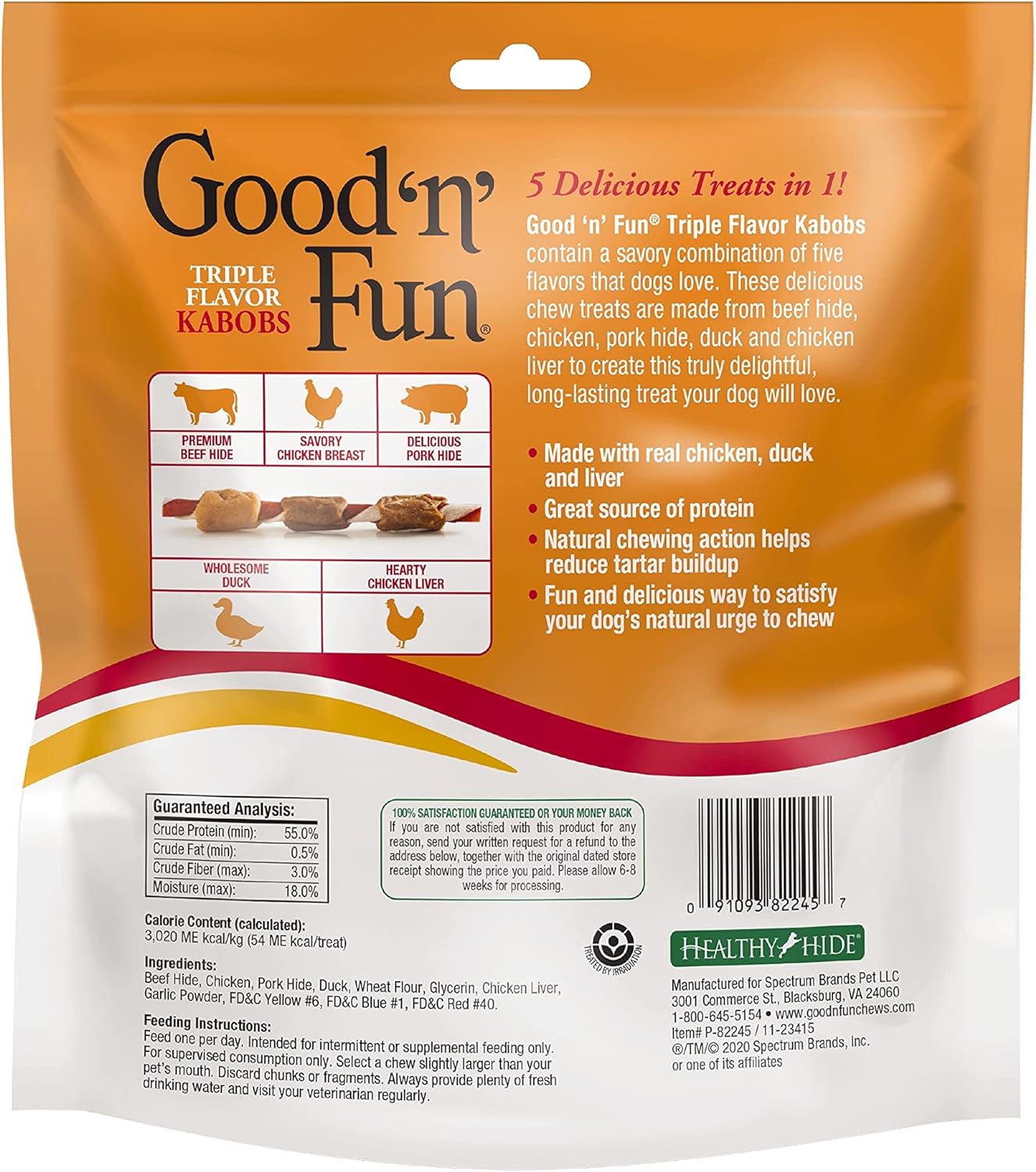 Good ‘N’ Fun Brand Contains A Savory Smorgasbord Of Flavors That Dogs Love Most. These Delicious Chew Treats Are Made From The Finest Ingredients, Including Premium Beef Hide And Real Chicken, To Create Truly Delightful, Long-Lasting Treats Your Dog Will Love. Good 'N' Fun Triple Flavor Kabobs Combine Irresistible Flavors Your Pup Will Crave. These Fun Shaped Chews Provide Long Lasting Entertainment That Both You And Your Dog Can Be Excited About. Each Treat Is Made From Pork Hide And Beef Hide, Then Wrapped With Real Chicken, Duck And Chicken Liver. With Meat Chunks They Can See And Flavor That Lasts, These Chews Will Have Your Dog Coming Back For More. Three Great Flavors Combine Into One Gourmet Dog Treat. Keep Chews Fresh With The Resealable Bag. This Pouch Contains 18 Kabobs. Kabobs Are Great For Any Sized Dog