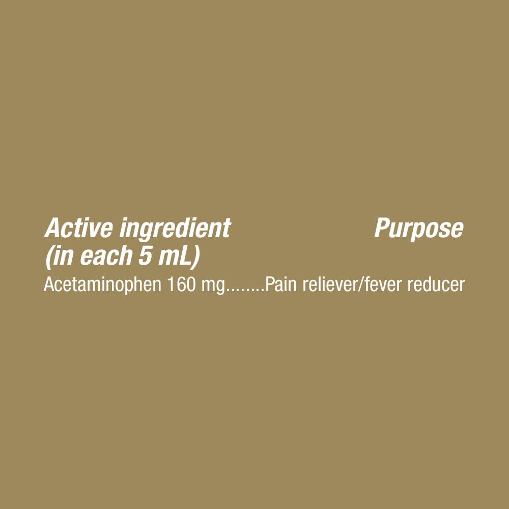 ACTIVE INGREDIENT: Children's Pain and Fever Oral Suspension contains acetaminophen 160 mg per 5 mL for fast, effective relief of fever and pain for children ages 2 to 11 years. Compare to the active ingredient of Children's Tylenol Oral Suspension