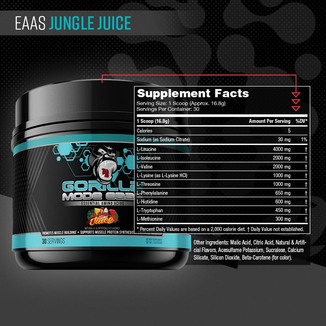 ALL NINE ESSENTIAL AMINO ACIDS - Essential Amino Acids (EAAs) are not produced in the body endogenously and therefore need to be ingested via diet or supplementation. Gorilla Mode EAAs ensures you reach the optimal amount of EAAs to reduce muscle degradation
