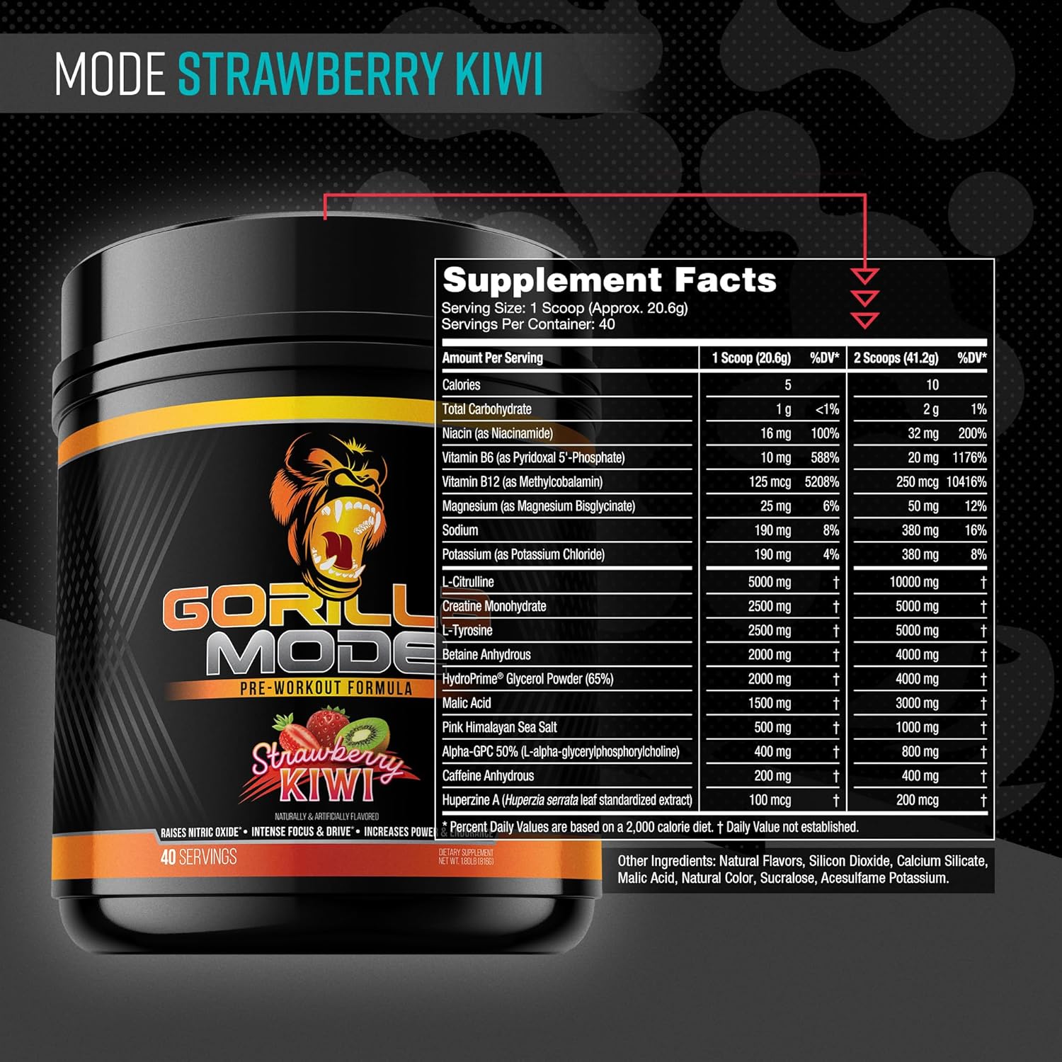 About this item GORILLA MODE 2.0: Please note any item that shows "Sold by Gorilla Mind, LLC" will be the new and improved, 2.0 version of Mode. Anything else is sold via distribution and CANNOT be guaranteed as the latest version of Mode. 10000 MG PURE L-CITRULLINE - The ONLY pre-workout in the entire industry featuring the maximum effective dosage of PURE L-Citrulline that IS NOT artificially inflated with Malic Acid on the label (with Citrulline Malate, you're only getting 1/2 - 2/3 as much L-Citrulline as the label implies). The huge spike in Nitric Oxide significantly increases pumps, endurance and can cut DOMS in half after training. 5000 MG CREATINE MONOHYDRATE, 4000 MG BETAINE, 4000 MG HYDROPRIME, 1000MG PINK HIMALAYAN SEA SALT - Supersaturates the muscle with blood and induces a state of hyper-hydration for massive pumps, endurance and power. Includes your daily saturation dose of Creatine and a backload of Sodium as a safeguard for Hydration. Creatine has been shown to significantly improve strength, power output and muscle size. Sodium complements Creatine by enhancing its uptake into muscles, supporting ATP production. 5000 MG L-TYROSINE, 800 MG Alpha-GPC, 400MG CAFFEINE, 200 MCG HUPERZINE A - Gorilla Mode features a spectrum of heavily dosed dopaminergics and cholinergics that rounds out this formula generating a significant increase in energy, focus, mood and overall force production. Lastly, a stimulant-based pre-workout would only be complete with a big 400mg dosage of Caffeine to reliably increase energy and performance. 33,000+ MG TOTAL ACTIVE INGREDIENTS - Gorilla Mode is the most potent and comprehensive pre-workout on the market in ALL aspects. Our relentless pursuit of innovation in formulation places us at the cutting edge of potency, with our maxed-out formulas setting new standards in the industry. Pump, strength, drive, endurance, cognitive enhancement, and overall performance all in one. MIXES EFFORTLESSLY AND TASTES INCREDIBLE - Pre-Workout ingredients are notoriously tricky to flavor. Products containing over 30 grams of ingredients often mix horribly and are tough to get down, but not ours. We have carefully selected ingredients like Hydroprime Glycerol that mix effortlessly and included flavor systems that we've personally tested for years. We can confidently say you'll look forward to drinking Gorilla Mode. See more product details,GORILLA MODE 2.0: Please note any item that shows "Sold by Gorilla Mind, LLC" will be the new and improved, 2.0 version of Mode. Anything else is sold via distribution and CANNOT be guaranteed as the latest version of Mode,10000 MG PURE L-CITRULLINE - The ONLY pre-workout in the entire industry featuring the maximum effective dosage of PURE L-Citrulline that IS NOT artificially inflated with Malic Acid on the label (with Citrulline Malate, you're only getting 1/2 - 2/3 as much L-Citrulline as the label implies). The huge spike in Nitric Oxide significantly increases pumps, endurance and can cut DOMS in half after training,5000 MG CREATINE MONOHYDRATE, 4000 MG BETAINE, 4000 MG HYDROPRIME, 1000MG PINK HIMALAYAN SEA SALT - Supersaturates the muscle with blood and induces a state of hyper-hydration for massive pumps, endurance and power. Includes your daily saturation dose of Creatine and a backload of Sodium as a safeguard for Hydration. Creatine has been shown to significantly improve strength, power output and muscle size. Sodium complements Creatine by enhancing its uptake into muscles, supporting ATP production,5000 MG L-TYROSINE, 800 MG Alpha-GPC, 400MG CAFFEINE, 200 MCG HUPERZINE A - Gorilla Mode features a spectrum of heavily dosed dopaminergics and cholinergics that rounds out this formula generating a significant increase in energy, focus, mood and overall force production. Lastly, a stimulant-based pre-workout would only be complete with a big 400mg dosage of Caffeine to reliably increase energy and performance,33,000+ MG TOTAL ACTIVE INGREDIENTS - Gorilla Mode is the most potent and comprehensive pre-workout on the market in ALL aspects. Our relentless pursuit of innovation in formulation places us at the cutting edge of potency, with our maxed-out formulas setting new standards in the industry. Pump, strength, drive, endurance, cognitive enhancement, and overall performance all in one,MIXES EFFORTLESSLY AND TASTES INCREDIBLE - Pre-Workout ingredients are notoriously tricky to flavor. Products containing over 30 grams of ingredients often mix horribly and are tough to get down, but not ours. We have carefully selected ingredients like Hydroprime Glycerol that mix effortlessly and included flavor systems that we've personally tested for years. We can confidently say you'll look forward to drinking Gorilla Mode