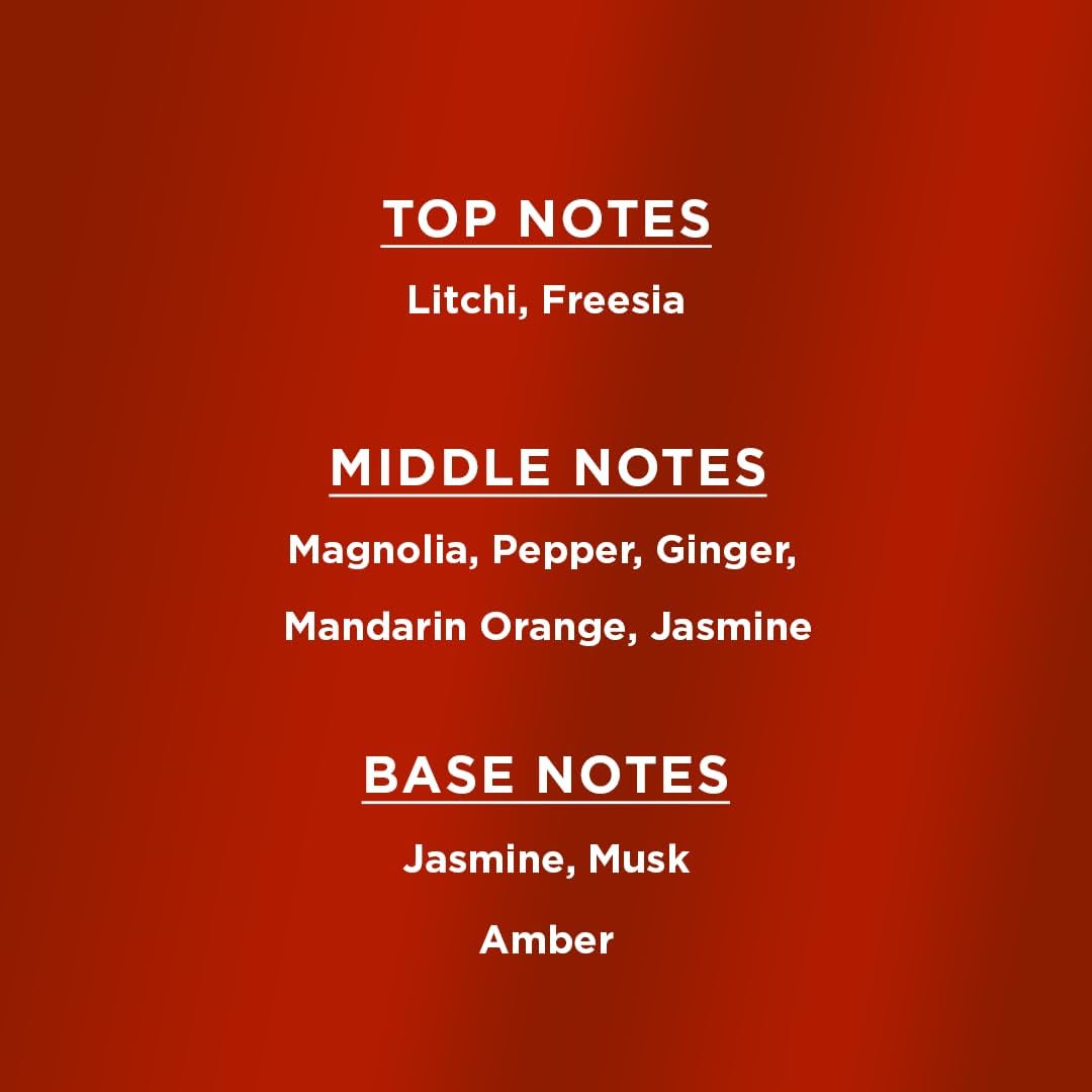 FLORAL & SPICY HEART: A captivating blend of magnolia, pepper, ginger, mandarin orange, and jasmine adds a vibrant twist, seamlessly balancing floral and subtle spice