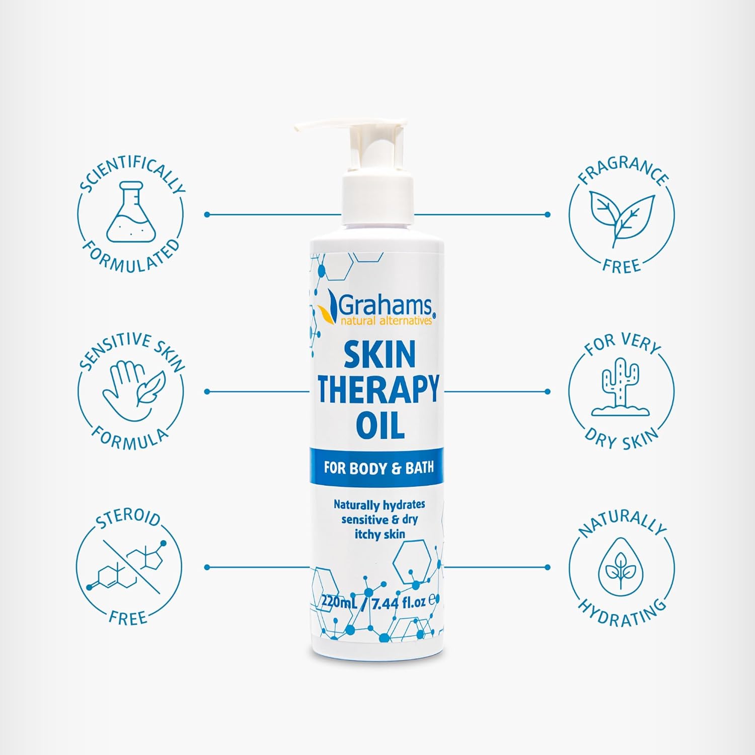 Grahams Natural Skin Therapy Body Oil - For Dry Skin, Eczema & Itch Relief - Hydrates & Nourishes Sensitive Skin - Natural 100% Oil Blend With Vitamin E | Hypoallergenic & Steroid-Free (220Ml)