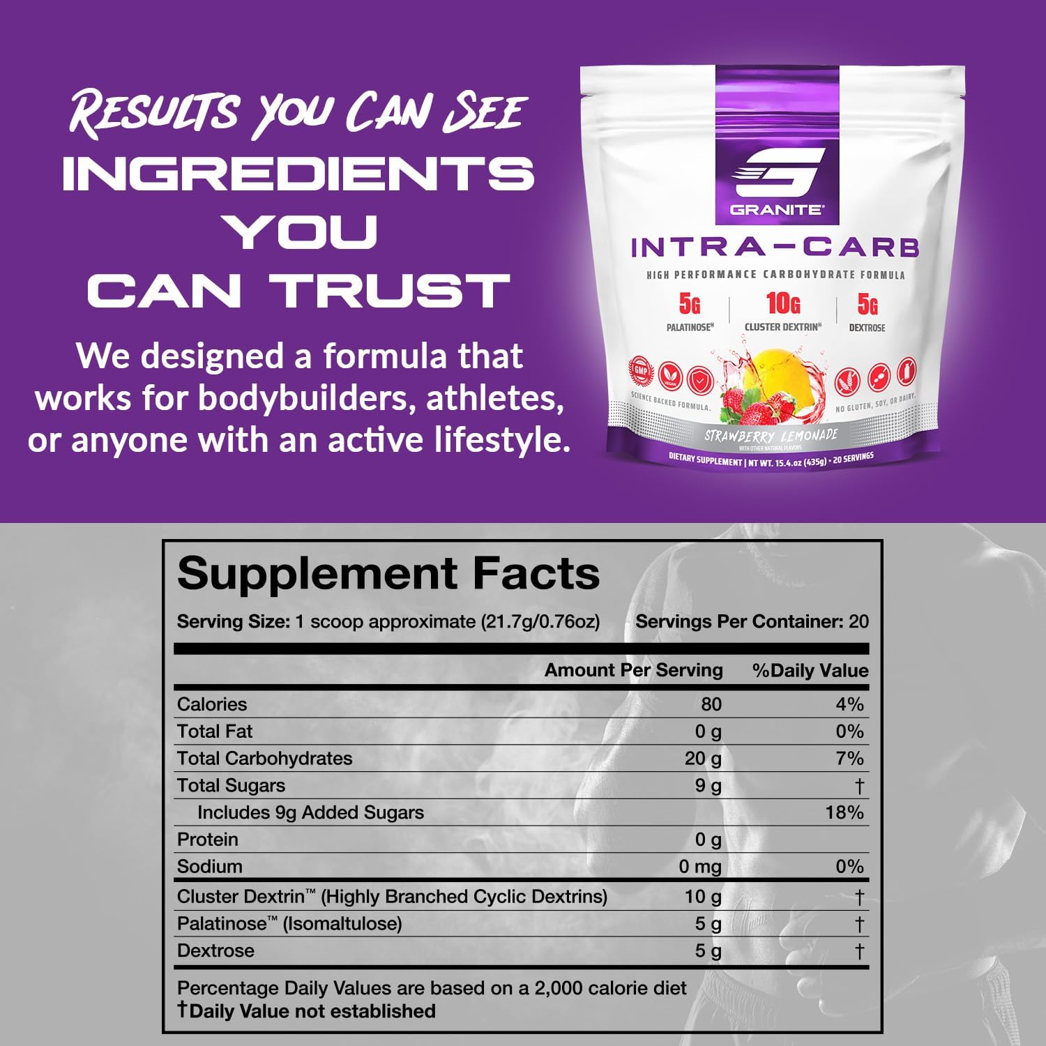 Granite Intra Carb Powder, Strawberry Lemonade Flavor, High-Performance Carbohydrate Blend With Cluster Dextrin, Palatinose, & Dextrose, Supports Energy And Training (20 Servings)