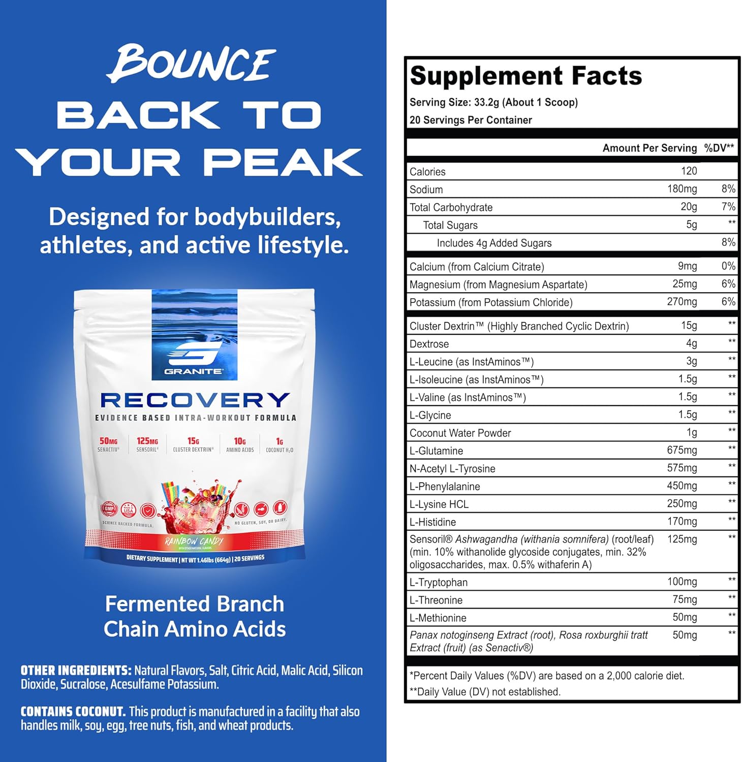 Granite Nutrition Recovery - Premium Intra-Workout Drink With Eaas, Cluster Dextrin, Sensoril & Senactiv For Athletic Performance And Lean Muscle Gains - Watermelon Candy (20 Servings)