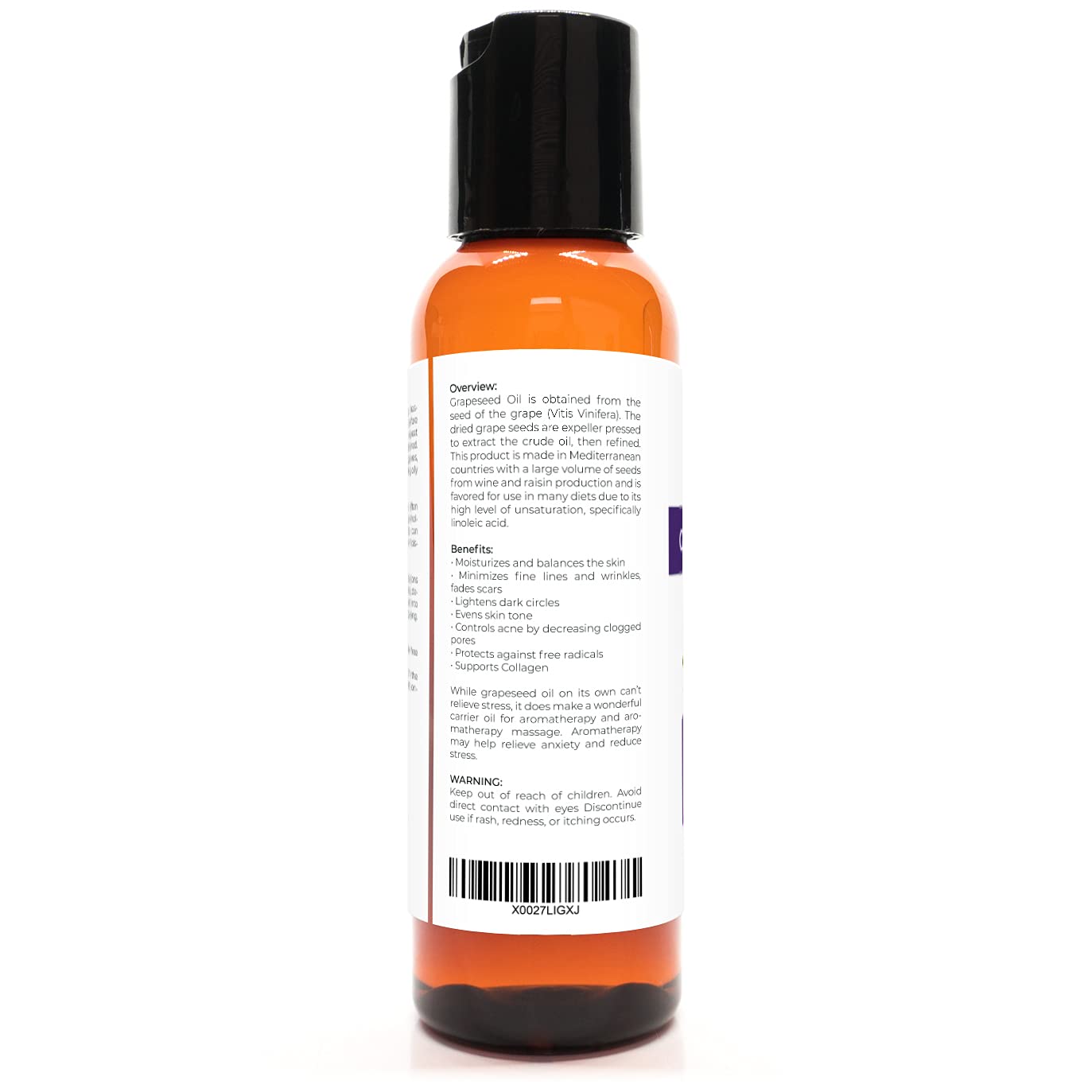 Grapeseed Oil is obtained from the seed of the grape (Vitis Vinifera). The dried grape seeds are expeller pressed to extract the crude oil, then refined. This product is made in Mediterranean countries with a large volume of seeds from wine and raisin production and is favored for use in many diets due to its high level of unsaturation, specifically linoleic acid. IMPORTANT! We sell our products by weight, not by volume! That is, different kind of oils might have different volume while the same bottle size and weight as they have different viscosity. Product Specifications Common Name: Grapeseed Oil Botanical Name: Vitis Vinifera Country of Origin: Italy. Extraction Method: Expeller Pressed Plant Part: Seed Oil Color: Yellow to yellowish-green Flavor / Odor / Aroma: Very faint, sweet scent To use grapeseed oil on your face, massage several drops into clean skin before you go to bed at night. You can repeat the process in the morning, if desired. Since grapeseed oil doesnât clog pores, itâs ideal for all skin types, including oily skin that needs moisturizing. If you have dandruff, which is often caused by a dry scalp, applying emollient grapeseed oil to your scalp can help loosen dead skin and restore moisture. Try massaging a couple of tablespoons of grapeseed oil (using more or less, depending on the length of your hair) into your hair and scalp before shampooing. 100% Pure & Natural Only One Ingredient: Our premium Grapeseed Oil is 100% Pure & Natural â No Additives, No Chemicals, No Alcohol, No Fragrance, and Not Diluted. Non-GMO. Made without pesticides. Frequently Asked Questions Q: Is it really 100% pure? What are the ingredients? Yes! there is only one ingredient: 100% Pure & Natural Grapeseed Oil (Vitis Vinifera). Q: Is It a Good Oil to Cook With? Grapeseed oil is sensitive to high heat and should not be used for frying. However, it can be safely used as a salad dressing or in baked goods. Q: What material is the bottle made of? Amber BPA-Free plastic. Q: Can I use it for hair? Absolutely! This carrier oil can be used alone or mixed with others. It is an excellent moisturizer for hair and skin. What are carrier oils? âCarrier Oilâ is a term generally used in the contexts of aromatherapy and cosmetic recipes for natural skin and hair care. Carrier oils and essential oils are made from plants. Carrier oils are used to dilute essential oils and âcarryâ them to your skin. Thatâs because essential oils are potent and can cause irritation when applied directly to your skin. A Carrier Oil is a vital aspect of an aromatherapy massage or a natural cosmetic such as a soap, bath oil, body oil, cream, lip balm, lotion, or other moisturizer, as it can affect the usefulness of the massage and the color, scent, therapeutic properties, and shelf life of the final product, respectively. Most carrier oils are unscented or lightly scented and donât interfere with an essential oilâs therapeutic properties. They may be used alone or with other oils to nourish your skin. Expeller Pressing It is a chemical-free process that involves placing the nuts or seeds in a horizontal press that has an 'expeller,' which is a rotating screw. The screw drives the nuts and seeds through a barrel-shaped hollow and compresses them until the high pressure squeezes out the oil, which seeps out through the opening, while the âmeal,â or the debris, remains inside the barrel. The oil is then filtered, resulting in the finished product. Due to the absence of solvent residues in Expeller Pressing, the outcome is cleaner, purer oils that are higher in natural colors and scents. (function(f) {var _np=(window.P._namespace("AplusModule"));if(_np.guardFatal){_np.guardFatal(f)(_np);}else{f(_np);}}(function(P) { // register javascript with unique module id P.when("jQuery", "AplusModules-module-6", "ready").execute(function($, hoverModule) { hoverModule("aplus-module-6-3"); }); })); Benefits & Uses Use in Salad Dressing Grape-seed oil is high in vitamin E and omega-6 fatty acids. Whisk it up with some balsamic vinegar and lemon juice, throw in your favorite herbs and spices, and you've got a healthy and delicious alternative to bottled dressing. Manages acne breakouts Grapeseed oil is high in linoleic acid, an omega-6 fatty acid that can help control acne by decreasing clogged pores. Acne-prone skin has been found to be deficient in linoleic acid â so adding more of this fatty acid to your skin via grapeseed oil can help to cut back on breakouts. It also rates as a very low 1 on the comedogenic scale, making it ideal for most skin types. Minimizes fine lines and wrinkles Thanks to the polyphenols found in grapeseed oil, these gems help combat premature aging and wrinkles. Along with fatty acids, grapeseedâs polyphenols also help to mitigate signs of premature aging while boosting circulation. This oil also has natural astringent properties, making the skin look tighter and more youthful. Moisturizes and balances the skin Grapeseed oil is chock full of vitamin E, which is excellent for locking moisture into the skin. This vitamin plays an essential role in softening and hydrating the skinâs outer layer. Meanwhile, itâs superstar fatty acid components fortify the skin barrier while smoothing and balancing the skin. Organic Neem Oil Lanolin Oil Sweet Almond Oil Organic Amla Oil Organic Jojoba Oil Pumpkin Seed Oil Add to Cart Add to Cart See Details Add to Cart Add to Cart Add to Cart Customer Reviews .aplus-v2 .aplus-review-right-padding { padding-right: 0.1rem; } 4.6 out of 5 stars 3,949 .aplus-v2 .aplus-review-right-padding { padding-right: 0.1rem; } 4.7 out of 5 stars 1,504 .aplus-v2 .aplus-review-right-padding { padding-right: 0.1rem; } â .aplus-v2 .aplus-review-right-padding { padding-right: 0.1rem; } 4.6 out of 5 stars 3,949 .aplus-v2 .aplus-review-right-padding { padding-right: 0.1rem; } 4.6 out of 5 stars 3,949 .aplus-v2 .aplus-review-right-padding { padding-right: 0.1rem; } 4.6 out of 5 stars 3,949 Price $14.