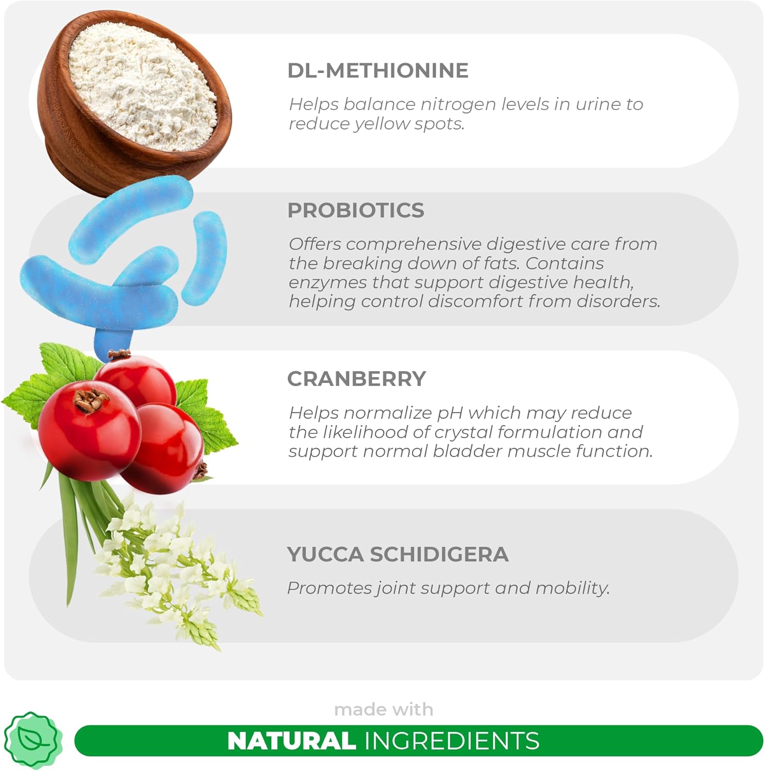 About this item Grass spot control - DL-Methionine helps balance nitrogen levels in your dog’s urine, supporting a greener, spot-free lawn. Urinary tract health - Cranberry and apple cider vinegar help support urinary pH and natural defense against UTIs. Digestive and immune support - Enzyme blend and probiotics (Bacillus coagulans) aid digestion and promote a healthy gut microbiome. Detox and odor control - Yucca schidigera extract supports toxin elimination and may reduce urine smell and body odor. Balanced enzyme function - Supports healthy breakdown of nutrients with added amylase, protease, lipase, and bromelain. › See more product details,Grass spot control - DL-Methionine helps balance nitrogen levels in your dog’s urine, supporting a greener, spot-free lawn,Urinary tract health - Cranberry and apple cider vinegar help support urinary pH and natural defense against UTIs,Digestive and immune support - Enzyme blend and probiotics (Bacillus coagulans) aid digestion and promote a healthy gut microbiome,Detox and odor control - Yucca schidigera extract supports toxin elimination and may reduce urine smell and body odor,Balanced enzyme function - Supports healthy breakdown of nutrients with added amylase, protease, lipase, and bromelain