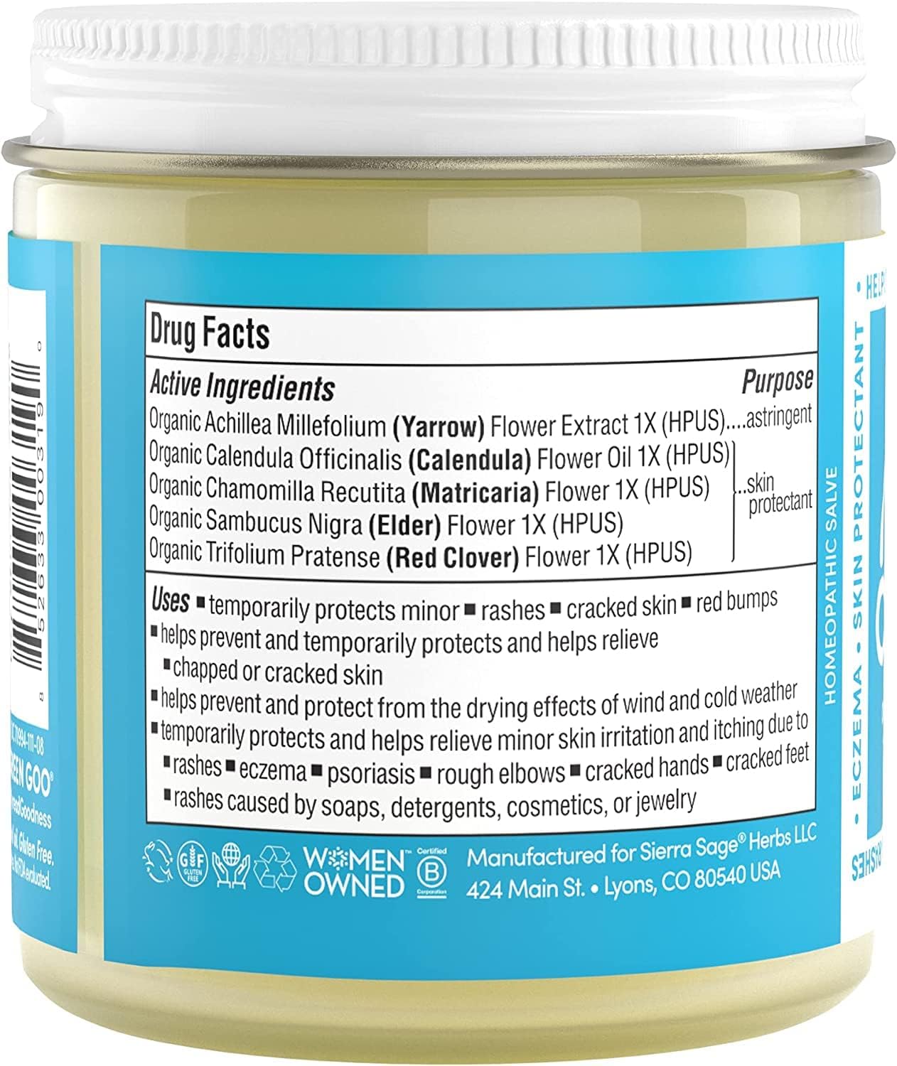 About this item DAILY WHOLE-BODY MOISTURIZER: Hydrated skin that doesn't itch will change your life. Our Dry Skin Salve can be used as both a body and facial cream and can be applied daily for general conditioning or as needed to give skin a hydrating boost. ALLEVIATES SYMPTOMS OF SKIN CONDITIONS: Dry Skin Salve helps temporarily relieve symptoms associated with chronic skin conditions like eczema, psoriasis, dry, red bumps, cracked hands & feet, windburn, and rashes. PLANT-BASED INGREDIENTS: Packed with natural ingredients such as calendula to moisturize, chamomile & elderflower to help calm skin irritation, and yarrow to astringe & cleanse. HOW TO USE: Apply generally for dry skin or to specifically affected area. The herbs, oils & beeswax are ideal for absorbing into your skin, but may take a second longer than lotion to soak in. A little goes a long way. However- need more, use more. GREEN GOO: Green Goo makes potent, portable first aid & body care products. We use only plant-based ingredients & slow infuse them in enriching oils. All Green Goo products are all-natural, organic, cruelty-free & paraben-free. PLANTS WITH PURPOSE β Green Goo is women owned, family run, and B-Corp certified See more product details,DAILY WHOLE-BODY MOISTURIZER: Hydrated skin that doesn't itch will change your life. Our Dry Skin Salve can be used as both a body and facial cream and can be applied daily for general conditioning or as needed to give skin a hydrating boost,ALLEVIATES SYMPTOMS OF SKIN CONDITIONS: Dry Skin Salve helps temporarily relieve symptoms associated with chronic skin conditions like eczema, psoriasis, dry, red bumps, cracked hands & feet, windburn, and rashes,PLANT-BASED INGREDIENTS: Packed with natural ingredients such as calendula to moisturize, chamomile & elderflower to help calm skin irritation, and yarrow to astringe & cleanse,HOW TO USE: Apply generally for dry skin or to specifically affected area. The herbs, oils & beeswax are ideal for absorbing into your skin, but may take a second longer than lotion to soak in. A little goes a long way. However- need more, use more,GREEN GOO: Green Goo makes potent, portable first aid & body care products. We use only plant-based ingredients & slow infuse them in enriching oils. All Green Goo products are all-natural, organic, cruelty-free & paraben-free,PLANTS WITH PURPOSE β Green Goo is women owned, family run, and B-Corp certified