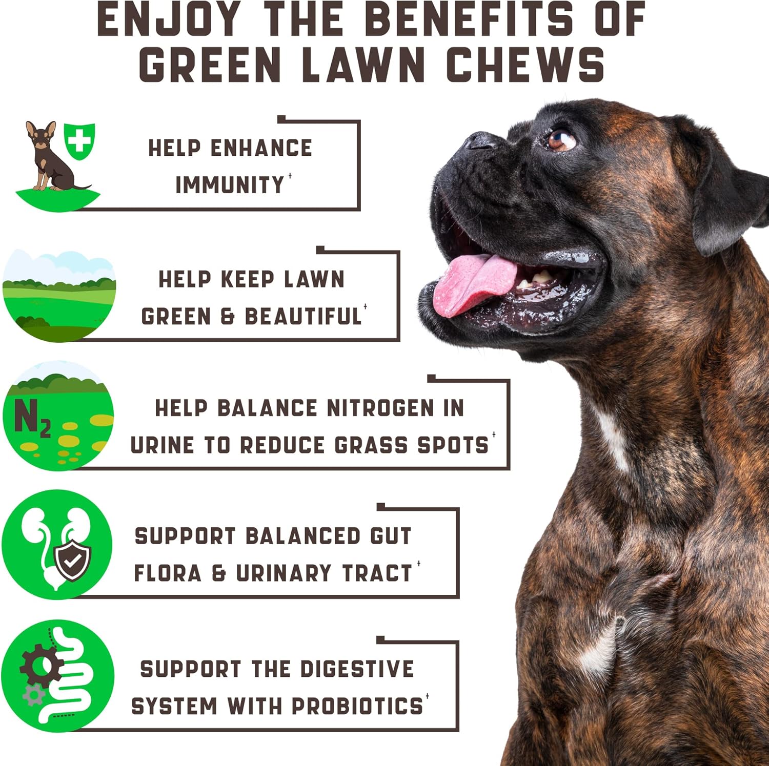Green & Beautiful Lawn: Green Lawn Chews For Dogs Help Decrease The Amount Of Nitrogen In Dog Urine & Deal With Unwanted Yellow Burn Spots On The Grass. A Great Solution To Support A Clean & Thriving Yard