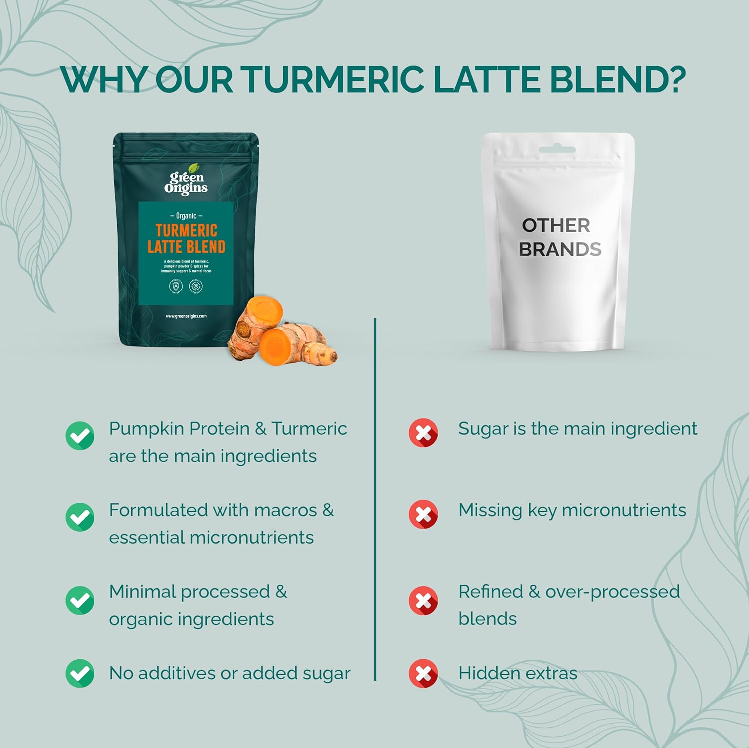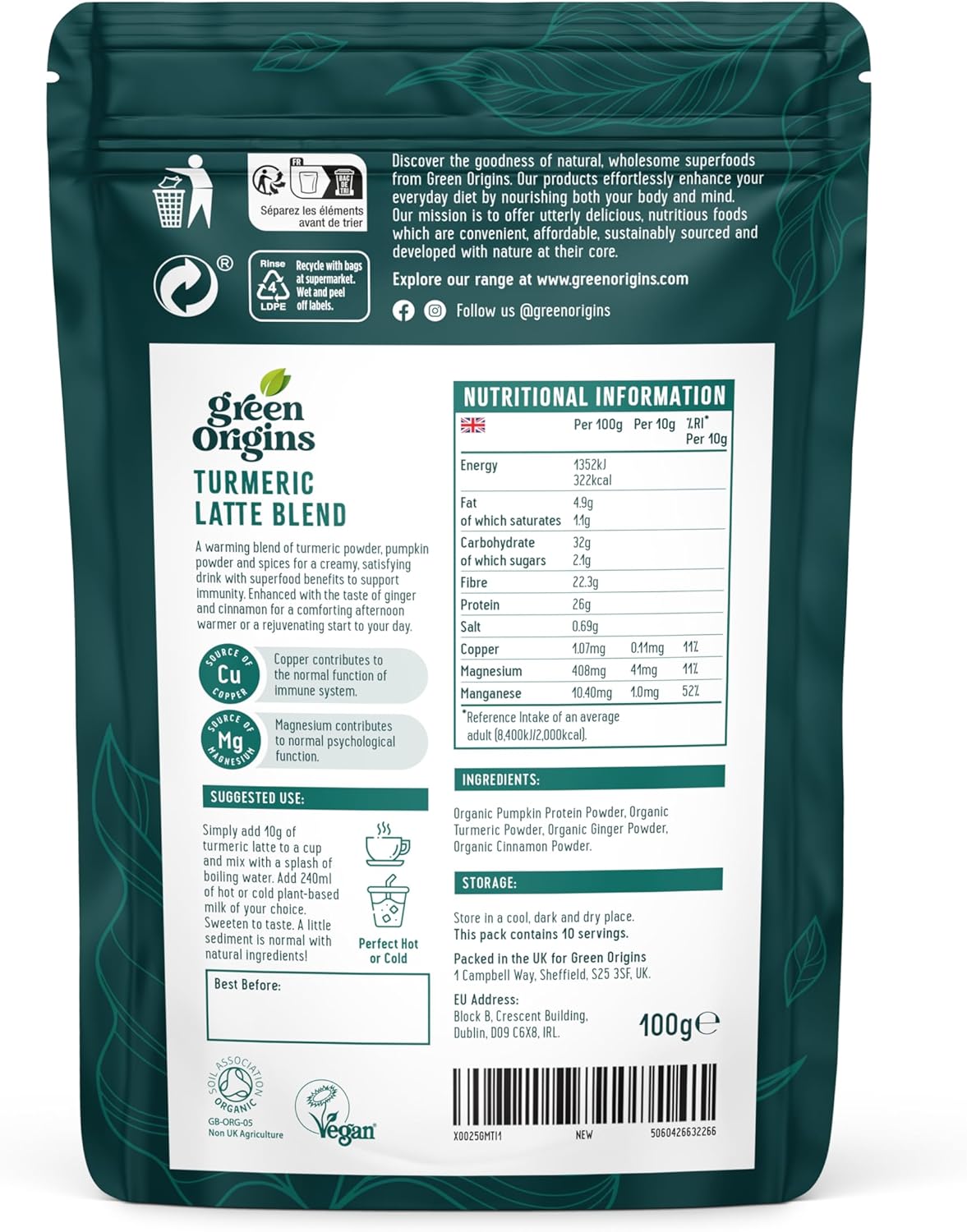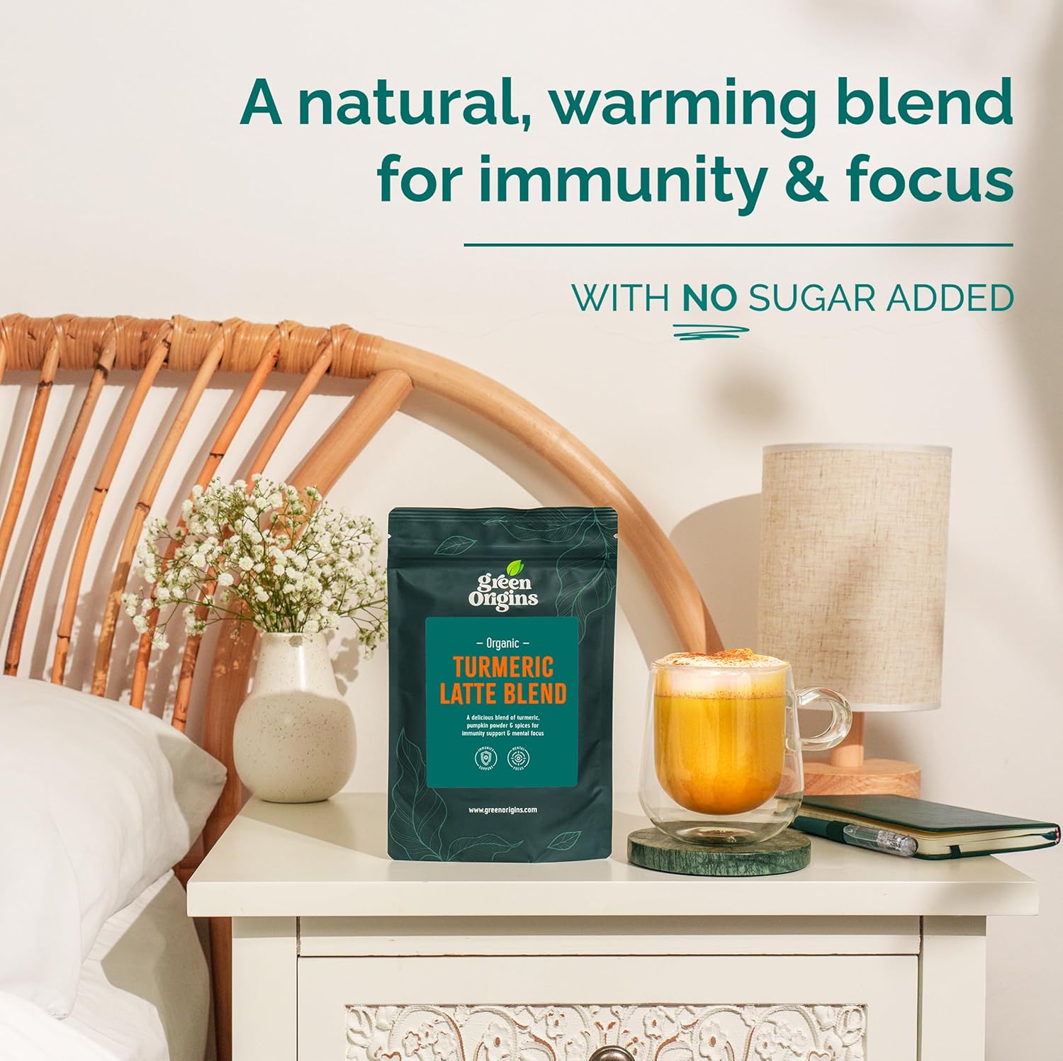 Green Origins Organic Super Turmeric Latte Blend With Ginger & Cinnamon For Natural Immunity & Mental Focus | Golden Milk Spice | 10 Servings, 100G | Vegan, Diary Free, Gluten Free, No Added Sugar