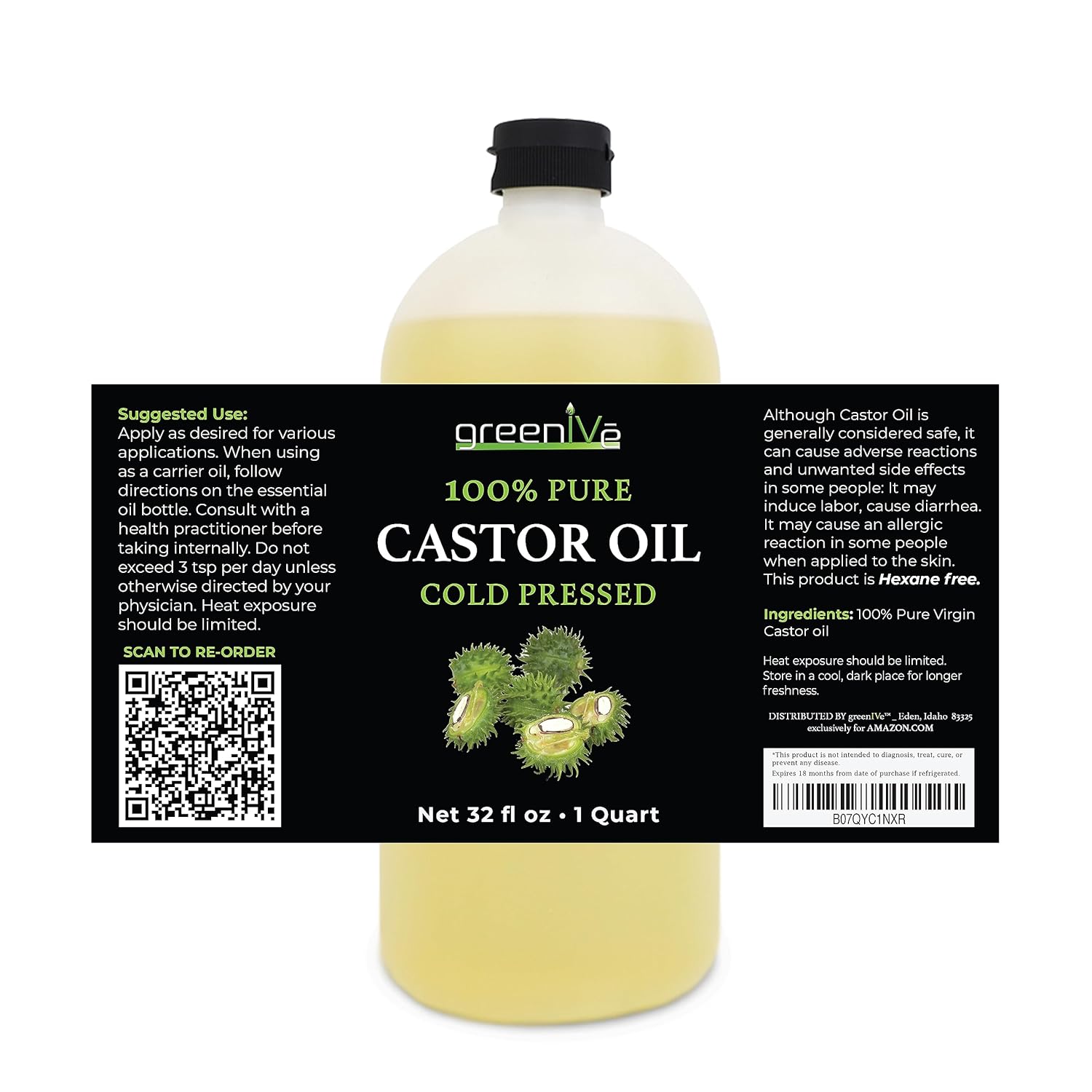 About this item QUALITY: GreenIVe Castor Oil is 100% Pure Virgin Cold Pressed. 0 Fillers, 0 Additives. Nothing added, Nothing taken away HAIR: Rich in Vitamins and Fatty Acids GreenIVe Castor Oil is excellent for Hair. Assisting in growth and strength of hair. Simply massage into the roots and work your way outward. Can also be used on eyelashes SKIN: Castor Oil is great for all skin types and can help restore the natural shine PURE: Cold Pressed Oil extraction maintaining the integrity and purity of the oil. Sourced from the highest quality, sustainably grown Castor Beans SATISFACTION: Backed by GreenIVe's 30 day guarantee! If you are not satisfied let us know! We'll make it right! See more product details,QUALITY: GreenIVe Castor Oil is 100% Pure Virgin Cold Pressed. 0 Fillers, 0 Additives. Nothing added, Nothing taken away,HAIR: Rich in Vitamins and Fatty Acids GreenIVe Castor Oil is excellent for Hair. Assisting in growth and strength of hair. Simply massage into the roots and work your way outward. Can also be used on eyelashes,SKIN: Castor Oil is great for all skin types and can help restore the natural shine,PURE: Cold Pressed Oil extraction maintaining the integrity and purity of the oil. Sourced from the highest quality, sustainably grown Castor Beans,SATISFACTION: Backed by GreenIVe's 30 day guarantee! If you are not satisfied let us know! We'll make it right!