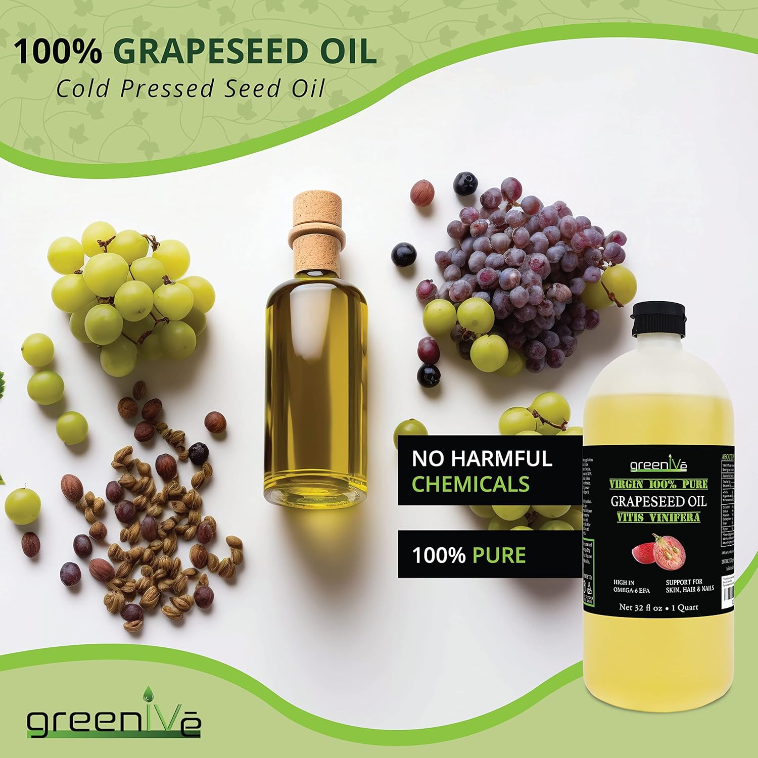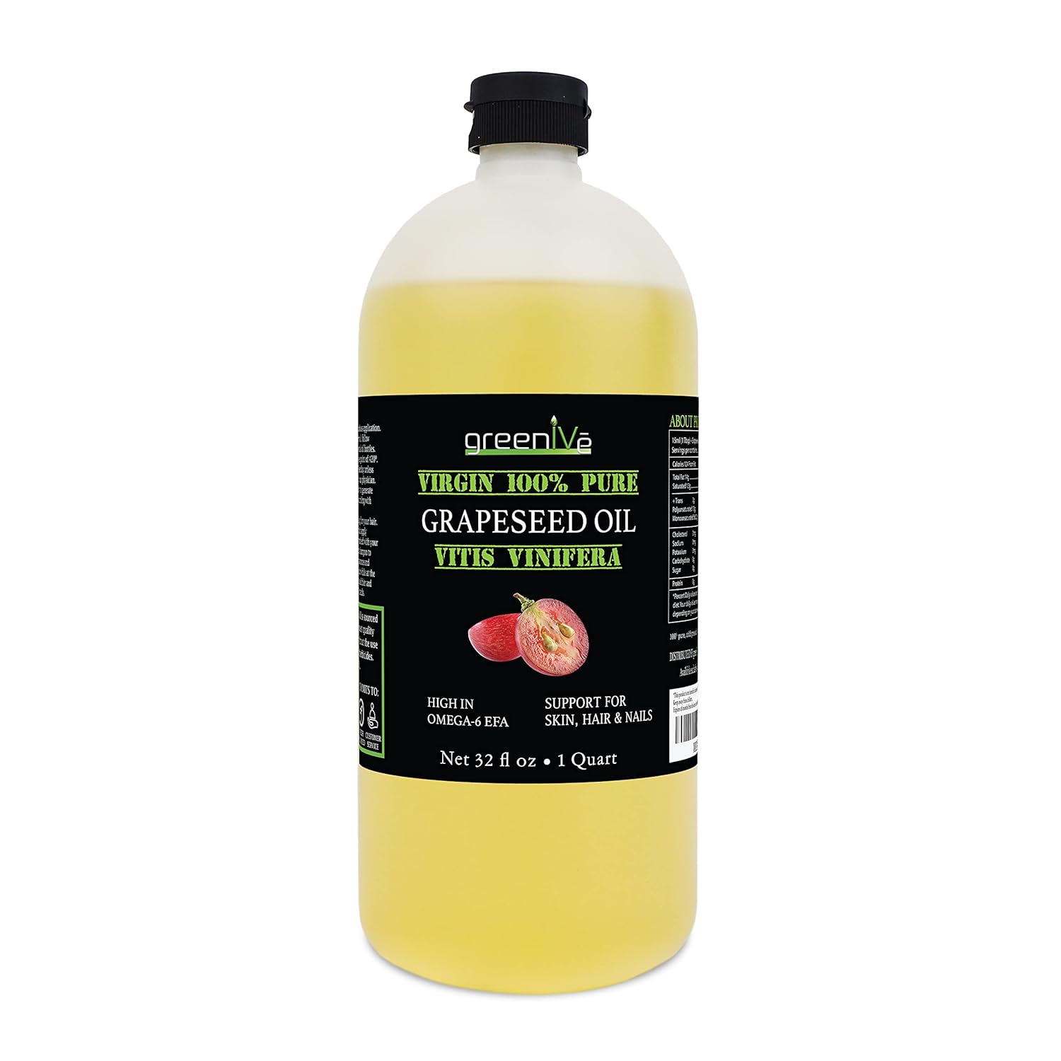 About this item QUALITY: 100% Pure Cold Pressed Grape Seed Oil sourced from the highest quality grapes. PURITY: GreenIVe Grape Seed Oil is of the Purest quality containing 0 Fillers, 0 Artificial Ingredients, and the Grapes are grown Organically FOOD GRADE: Grape Seed Oil is an excellent food oil! practically flavorless and a very high smoke point makes it an ideal oil for cooking or sautéing with. CARRIER OIL: GreenIVe Grape Seed Oil is an excellent choice when it comes to carrier oils. Use as directed on your essential oil bottle when using as a carrier oil See more product details,QUALITY: 100% Pure Cold Pressed Grape Seed Oil sourced from the highest quality grapes,PURITY: GreenIVe Grape Seed Oil is of the Purest quality containing 0 Fillers, 0 Artificial Ingredients, and the Grapes are grown Organically,FOOD GRADE: Grape Seed Oil is an excellent food oil! practically flavorless and a very high smoke point makes it an ideal oil for cooking or sautéing with,CARRIER OIL: GreenIVe Grape Seed Oil is an excellent choice when it comes to carrier oils. Use as directed on your essential oil bottle when using as a carrier oil