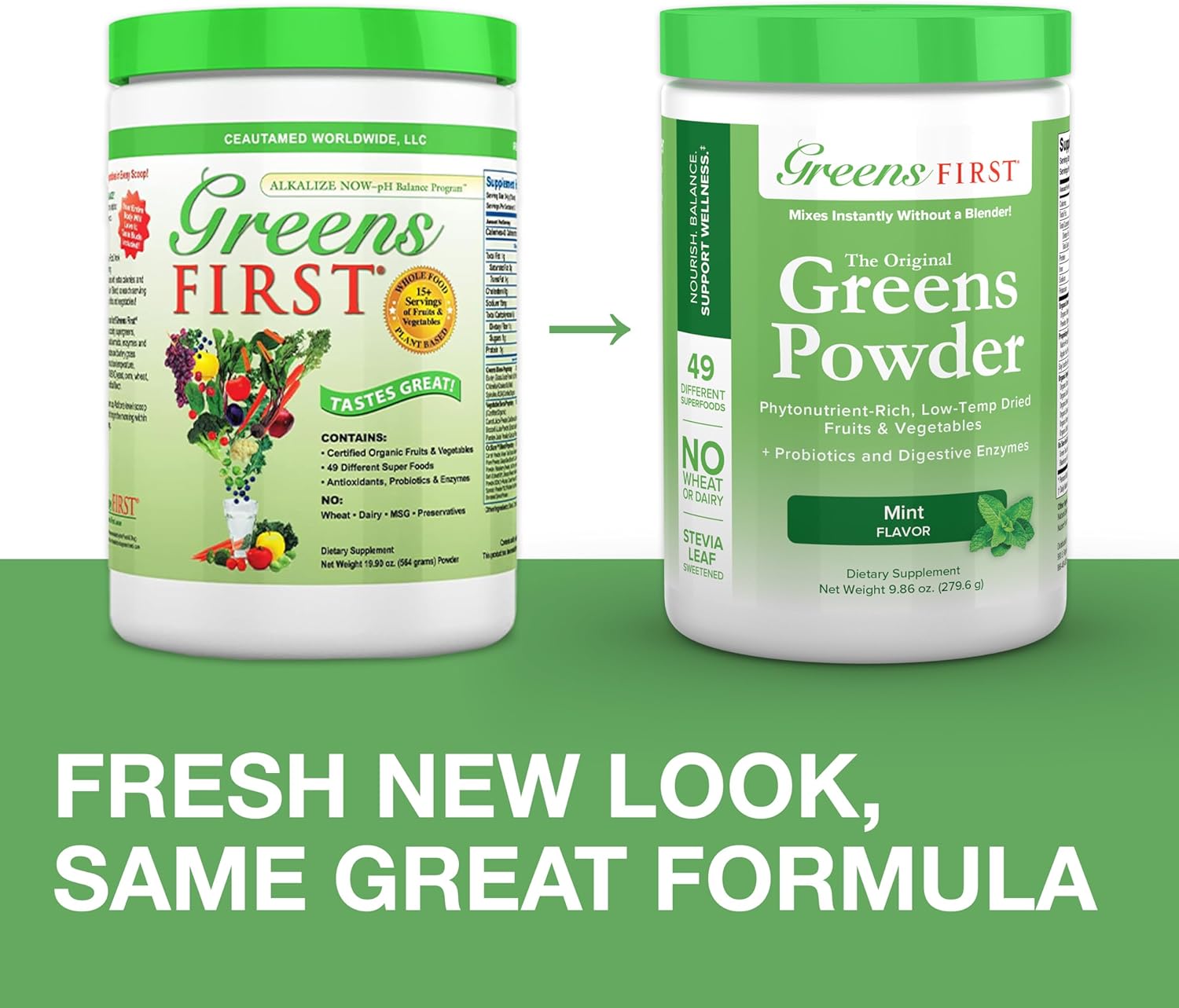 Greens First - Mint - 30 Servings - Greens Powder Superfood, 49 Superfoods, 15+ Organic Fruit & Vegetables, Antioxidant Smoothie Mix Supplement, Dairy Free, Vegan & Non-Gmo - 9.86 Oz