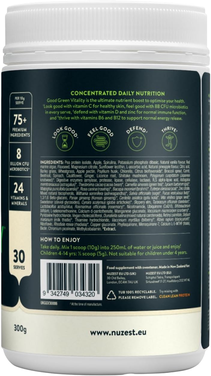 Greens Powder By Nuzest – Good Green Vitality – Filled With Vitamins, Minerals & Superfoods – Vegan Multivitamin Greens Drink - Gluten Free - Dairy Free - 300G - 30 Servings