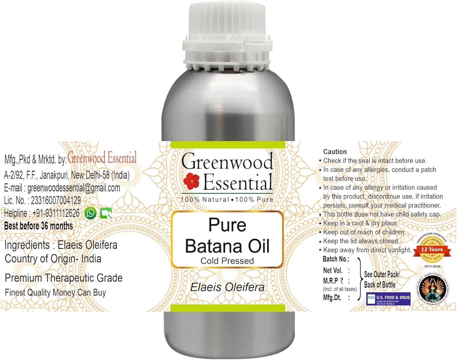 About this item Quantity - 1250ml (42 oz), Container Type - High Quality Aluminium Bottle designed to preserve potency. Method of Extraction - Cold Pressed, Botanical Name -Elaeis oleifera, Daily skin care Regimen, Lightweight, Non-greasy, Non-sticky, For all seasons Features- Pure, Natural, Undiluted, Therapeutic Grade, Alcohol-Free, Solvent Free, Cruelty-Free, Paraben Free, Single ingredient, No Additives, No preservatives, Non-deodorized, Vegan, Suitable for All Skin Type. Additional Usage - Carrier oils are widely used in Beauty Products for moisturisation nourishment and aromatherapy. AROMA: Carrier Oils are NOT aromatic oils. Most natural carrier oils have FAINT OR NO AROMA. We do not add synthetic aroma to make our oils attractive, unlike many other brands. Batana Oil is used for therapeutic purposes & has very faint or no aroma. For Skin & Hair Application- Cold-pressed or Carrier Oils can be applied directly to the skin. It is derived from plant sources. Use it alone or with other oils to nourish your skin. It can also be used to dilute essential oils to carry them into the skin. Purchase with full assurance: We have been offering 'No Questions Asked reimbursement' for the last 13 years. We believe our oils will impart lasting therapeutic benefits to you. › See more product details,Quantity - 1250ml (42 oz), Container Type - High Quality Aluminium Bottle designed to preserve potency. Method of Extraction - Cold Pressed, Botanical Name -Elaeis oleifera, Daily skin care Regimen, Lightweight, Non-greasy, Non-sticky, For all seasons,Features- Pure, Natural, Undiluted, Therapeutic Grade, Alcohol-Free, Solvent Free, Cruelty-Free, Paraben Free, Single ingredient, No Additives, No preservatives, Non-deodorized, Vegan, Suitable for All Skin Type. Additional Usage - Carrier oils are widely used in Beauty Products for moisturisation nourishment and aromatherapy,AROMA: Carrier Oils are NOT aromatic oils. Most natural carrier oils have FAINT OR NO AROMA. We do not add synthetic aroma to make our oils attractive, unlike many other brands. Batana Oil is used for therapeutic purposes & has very faint or no aroma,For Skin & Hair Application- Cold-pressed or Carrier Oils can be applied directly to the skin. It is derived from plant sources. Use it alone or with other oils to nourish your skin. It can also be used to dilute essential oils to carry them into the skin,Purchase with full assurance: We have been offering 'No Questions Asked reimbursement' for the last 13 years. We believe our oils will impart lasting therapeutic benefits to you