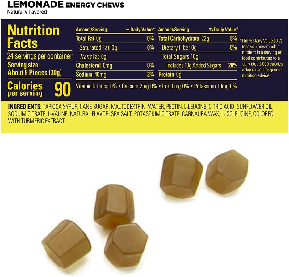 DESCRIPTION : GU Energy Chews pack energy-dense calories to help you fuel on-the-go. This highly portable bag contains sixteen (16) bite-sized Chews, which translates to two (2) servings, making it easier to eat and fuel at your own pace. These mini versions of our Energy Chews also have electrolytes and amino acids to keep you feeling strong. Lemonade Energy Chews are caffeine-free and each serving has 40mg of Sodium to help maintain water balance. GU Energy Chews contain 90 calories per serving