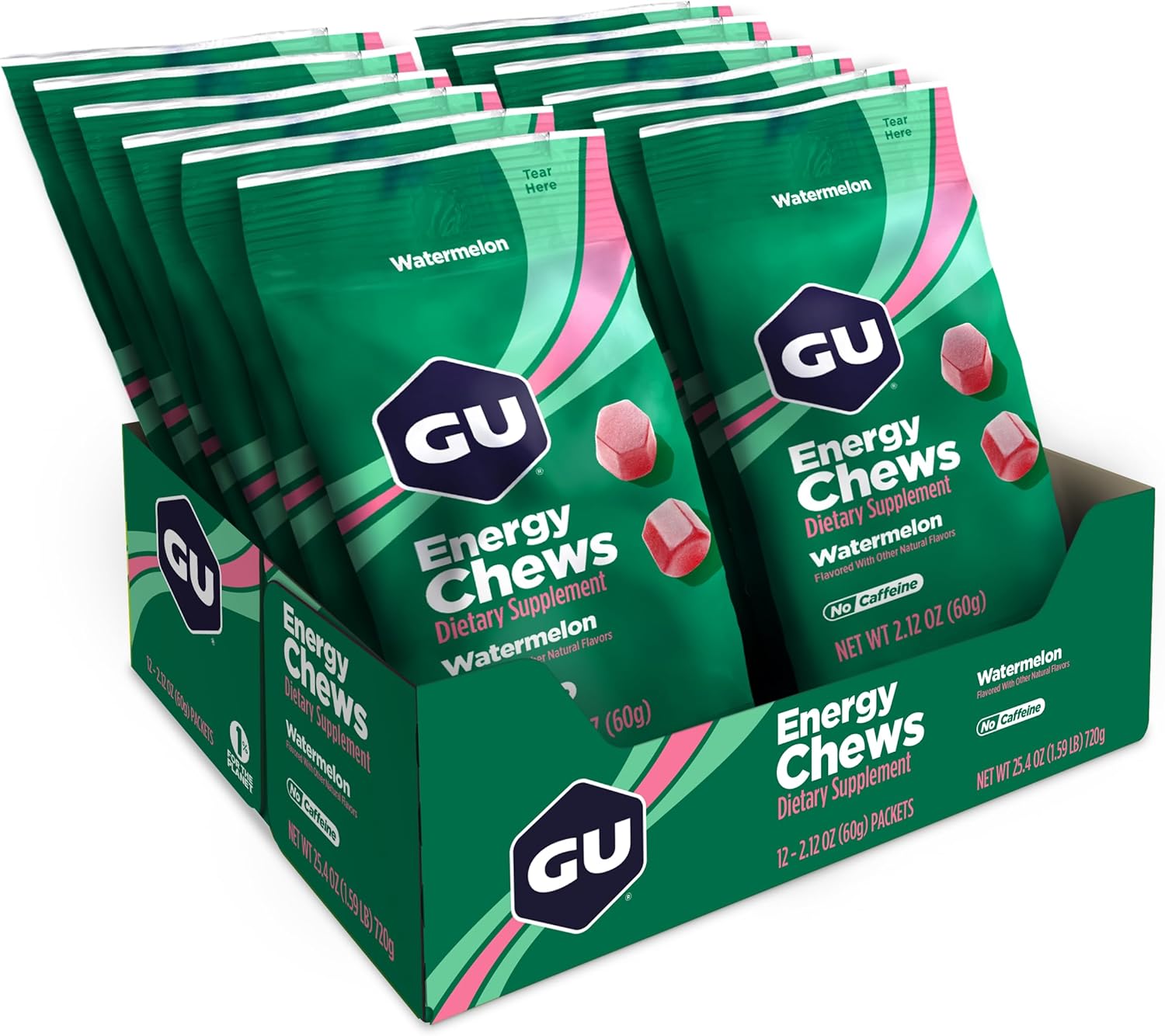 About this item Each bag contains two (2) servings of bite-sized Chews to help you fuel on-the-go with tasty energy-dense calories. Each bag contains sixteen (16) mini Chews that make it easy to eat and fuel at your own pace. Energy chews for runners: amino acids to keep you feeling strong and help prevent mental fatigue. Electrolytes in running gummies will help you stay hydrated by maintaining water balance whether running, biking, hiking, or skiing Watermelon Energy Chews are caffeine-free. All GU Energy Chews are Gluten-Free and Vegan. See more product details,Each bag contains two (2) servings of bite-sized Chews to help you fuel on-the-go with tasty energy-dense calories,Each bag contains sixteen (16) mini Chews that make it easy to eat and fuel at your own pace,Energy chews for runners: amino acids to keep you feeling strong and help prevent mental fatigue,Electrolytes in running gummies will help you stay hydrated by maintaining water balance whether running, biking, hiking, or skiing,Watermelon Energy Chews are caffeine-free. All GU Energy Chews are Gluten-Free and Vegan