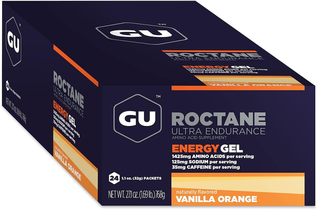 GU Roctane Ultra Endurance Energy Gel is a high-intensity offering from GU, the original sports energy gel. Designed for extreme and long-duration endurance activities, GU Roctane Energy Gel comes in highly compact, portable, and calorie-dense packets that are loaded with carbohydrates that can be rapidly absorbed. Athletes performing at a high level for hours on end need more from their nutrition, which is why Roctane Energy Gel packs three-times the amino acids and twice the sodium as original GU Energy Gel. These ingredients boost Roctaneās efforts to help decrease muscle damage, promote muscle repair, and maintain water balance. Each packet of GU Roctane Ultra Endurance Energy Gel contains 100 calories and 1425mg of amino acids,The Ultra-Endurance Energy Gel - 100 calories and essential electrolytes in a portable packet,1425mg of amino acids help decrease muscle damage and mental fatigue whether running, biking, hiking or skiing,Dual-source energy from maltodextrin and fructose that use non-competing pathways for efficient absorption and lasting energy,Use for high-intensity racing or training year-round! Take one packet 5 minutes before and every 45 minutes during activity,Sea Salt Chocolate contains 35mg Caffeine, 180mg Sodium