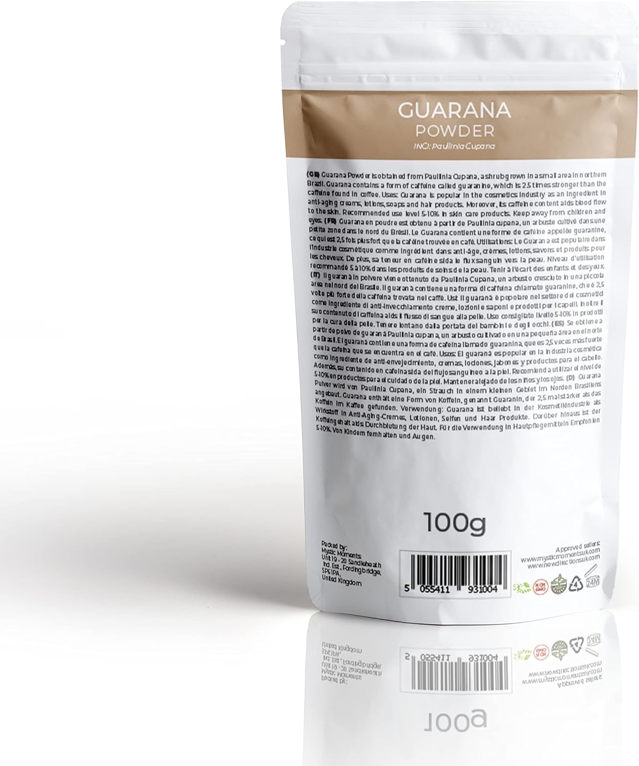 Guarana Powder 100g Botanical Name: Paullinia Cupana Description: Guarana Powder extract is obtained from guarana, Paullinia cupana, a shrub grown in a small area in northern Brazil which, when cultivated it can grow up to 2m high. Its fruit is a reddish-brown colour and has the size similar to that of an almond. Guarana contains a form of caffeine called guaranine, which is 2.5 times stronger than the caffeine found in coffee, tea and soft drinks, therefore has a long history of use as an energy tonic and for mental acuity enhancement. Do not consume. For external use only. Keep away from children and eyes