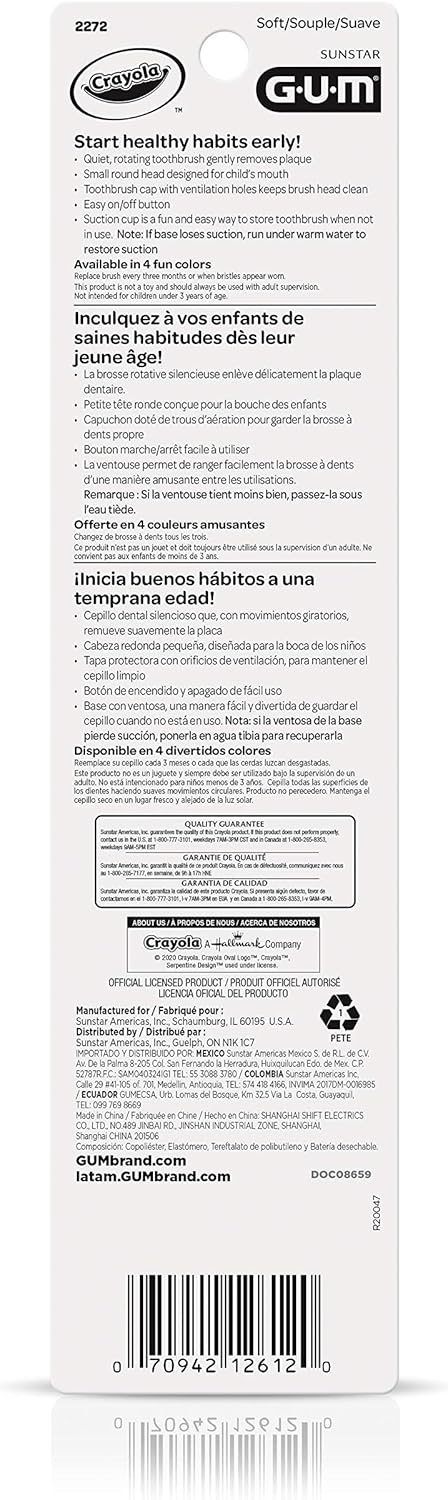 Product Description Build healthy habits with the GUM Crayola Battery Power Toothbrush for Kids. Turn toothbrushing time into a fun experience your children will look forward to! Our kids’ toothbrushes feature a battery-powered oscillating head and colorful marker design that encourage engagement in lifelong healthy habits. Batteries included, not replaceable or removable. These toothbrushes are especially suited to children aged 3+. Our kids’ toothbrush features a small-sized head that makes it easy to clean hard-to-reach teeth in the back of the mouth. Ultra-soft, oscillating bristles offer gentle and effective plaque removal that prevents tooth decay at this important age. Finally, each of our toothbrushes for kids comes with a suction cup bottom that doubles as a toothbrush cap. This fun feature allows the children's toothbrush to be stored upright for cleaner bristles and lessctertop clutter. The CDC recommends that children brush their teeth twice a day using a pea-sized amount of fluoride toothpaste. Don't wait! Start motivating your family today to build healthy habits they can carry with them for life. Manufacturer Contact Information 1-888-777-3101,MAKE BRUSHING FUN: Each kids’ battery toothbrush includes a bright Crayola design and 75 stickers that encourage children to engage with brushing. Batteries included, not replaceable or removable,DESIGNED JUST FOR KIDS: Our soft kids’ toothbrushes have a small, oscillating head that makes it easy to clean hard-to-reach teeth in the back of the mouth. This toothbrush is specifically designed for kids aged 3+,ULTRA-SOFT BRISTLES: Each GUM kids’ toothbrush comes with ultra-soft bristles that effectively remove plaque without damaging tooth enamel or gums,SUctION BASE + TRAVEL CAP: Each of our kids’ toothbrushes includes a hygienic travel cap and a suction cup base for clean and clutter-free storage while not in use,HEALTHY STARTS HERE: Research continues to show the connection between oral health and overall health. The GUM brand is committed to providing innovative oral care products that make between-teeth cleaning accessible for everyone