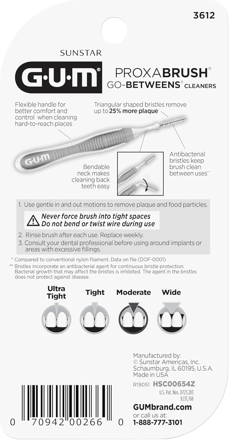 Product Description Go beyond brushing with GUM Proxabrush Go-Betweens. Between-teeth cleaning is essential for removing plaque from hard-to-reach areas that are missed by brushing alone....But tight teeth, difficulty gripping floss, and a simple lack of time prevent many of us from flossing as often as we should. Proxabrush Go-Betweens Interdental Cleaners are clinically designed by dental professionals to offer a quick, easy, and effective alternative to flossing. Our Moderate reusable floss brushes are specifically made to remove plaque and food particles from between moderately spaced teeth, the perfect braces cleaner. Each floss brush features coated antibacterial bristles and a breathable travel cap that allows for up to ten days of use. With GUM Proxabrush Go-Betweens, cleaning the hard-to-reach areas in your mouth has never been easier. A non-slip rubber handle and bendable neck make it easy to maneuver to the back of the mouth while nylon coated wire cleans around braces, bridges, implants, and other dental devices without the risk of scratching or galvanic shock. Features : Designed for moderate interdental spaces Triangular bristles for 25% more effective plaque removal* Nylon coated wire is a perfect braces brush for cleaning. Hygienic coated antibacterial bristles and a breathable travel cap allow 10 days of use Non-slip rubber handle for easy grip Bendable neck for further reach Our dental brushes make it easy to carry a confident smile with you wherever you go. Different from flosser picks, each interdental brush features a compact, portable size that fits easily into purses, pockets, and travel kits for healthier gums, cleaner teeth, and fresher breath - anytime, anywhere. *vs DOF-0001 Manufacturer Contact Information,DEEP CLEANING : GUM Proxabrush Go-Betweens feature soft bristles that slide between the teeth for a deep-cleaning alternative to floss that removes plaque that can't be reached with tooth brushing alone,MODERATE : Our Moderate interdental brush between-teeth cleaners are specifically crafted to effectively clean between moderately spaced teeth. Also available in: Ultra Tight, Tight, and Wide,COMPAct & REUSABLE : GUM dental picks are PERFECT for carrying in your purse or travel kit when you're on the go. Each floss pick comes with a protective travel cap and bristles that are treated with a hygienic solution for up to ten days of use,PERFECT FOR BRACES & APPLIANCES : Our floss brushes are clinically designed with nylon-coated wire that comfortably cleans around braces, fixtures, implants, and other dental devices without causing scratching or galvanic shock,HEALTHY STARTS HERE : Research continues to show the connection between oral health and overall health. The GUM brand is committed to providing innovative products for between-teeth cleaning to help everyone achieve their healthiest life possible