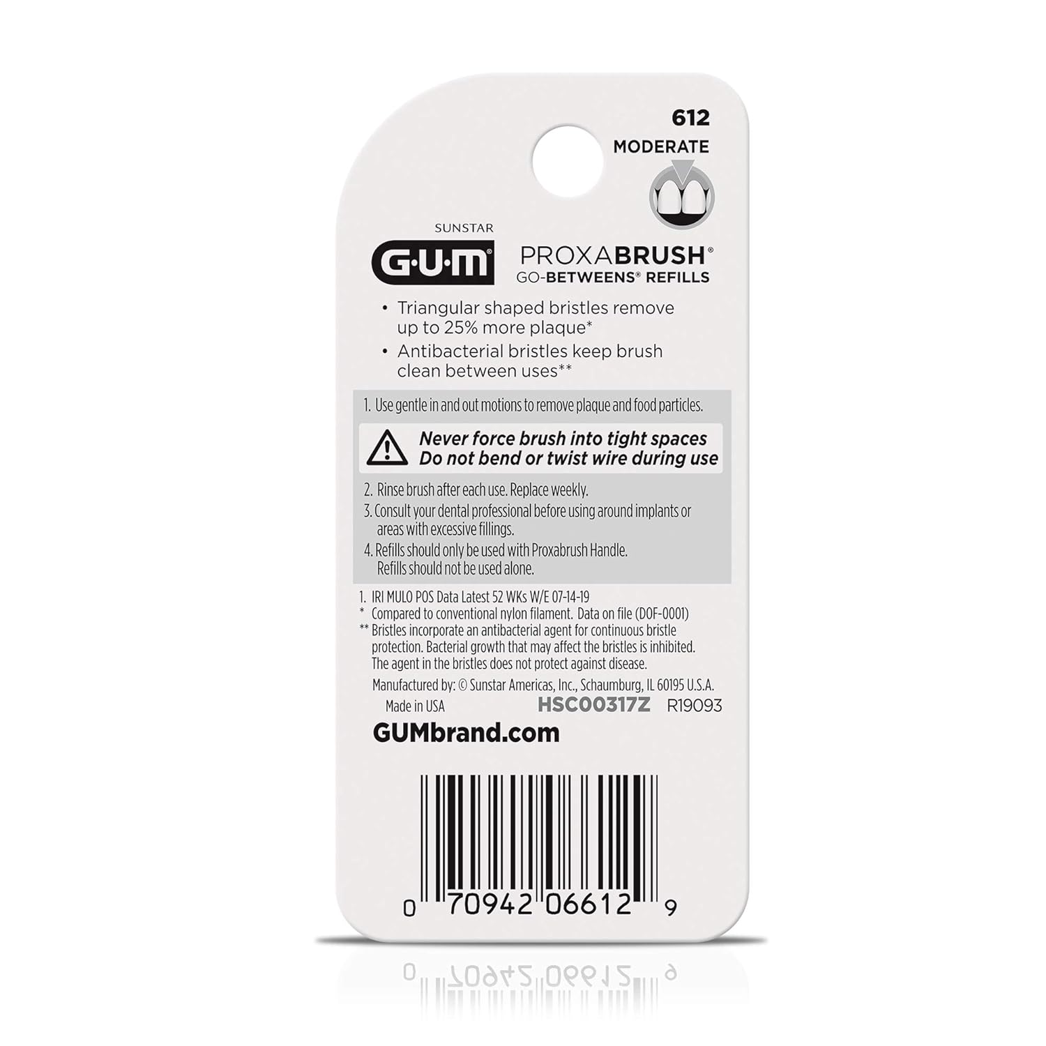 Product Description Go beyond brushing with GUM Proxabrush Go-Betweens. Between-teeth cleaning is essential for removing plaque from hard-to-reach areas that are missed by brushing alone....But tight teeth, difficulty gripping floss, and a simple lack of time prevent many of us from flossing as often as we should. GUM Proxabrush refills are compatible with both the GUM permanent handle and the GUM dual-ended-handle. Our permanent handle dental cleaners are designed by dental professionals to offer a quick, easy, and effective alternative to flossing. With GUM Proxabrush Go-Betweens, cleaning the hard-to-reach areas in your mouth has never been easier. A non-slip rubber handle makes it easy to maneuver to the back of the mouth. Each brush comes with nylon coated wire that cleans around braces, bridges, implants, and other dental devices without the risk of scratching or galvanic shock. Our moderate floss brush refills are specifically made to remove plaque and food particles from moderate interdental spaces. Each floss brush is treated with a hygienic solution that allows for up to ten days of use. Manufacturer Contact Information 1-888-777-3101,GUM PROXABRUSH REFILLS : Our dental brush refills are compatible with the GUM permanent handle and the GUM dual-ended-handle. Each floss brush is treated with a hygienic solution for up to 10 days of use for an effective alternative to flossing,DEEP CLEANING : GUM Proxabrush Go-Betweens feature soft bristles that slide between the teeth to remove plaque and food particles that can't be reached with tooth brushing alone,MODERATE : Our Moderate interdental brushes are specifically crafted to effectively clean between moderately spaced teeth. Also available in Tight and Wide options,PERFECT FOR BRACES & APPLIANCES : Our floss brushes are clinically designed with nylon-coated wire that comfortably cleans around braces, fixtures, implants, and other dental devices without causing scratching or galvanic shock,HEALTHY STARTS HERE : Research continues to show the connection between oral health and overall health. The GUM brand is committed to providing innovative products for between-teeth cleaning to help everyone achieve their healthiest life possible