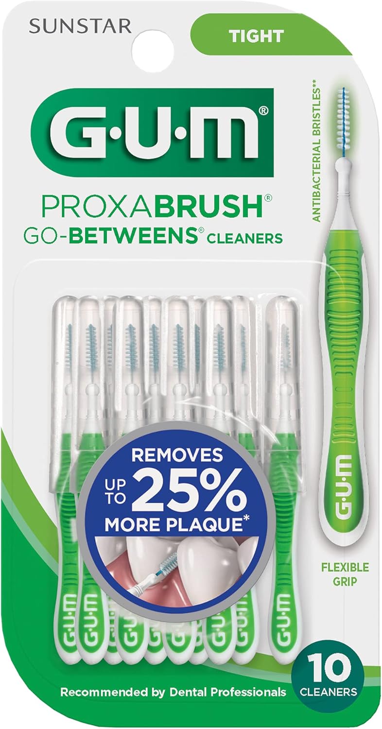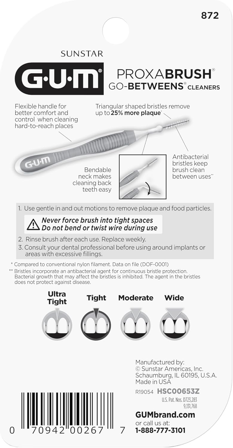 Go beyond brushing with GUM Proxabrush Go-Betweens. Between-teeth cleaning is essential for removing plaque from hard-to-reach areas that are missed by brushing alone....But tight teeth, difficulty gripping floss, and a simple lack of time prevent many of us from flossing as often as we should. Proxabrush Go-Betweens Interdental Cleaners are clinically designed by dental professionals to offer a quick, easy, and effective alternative to flossing. Our Wide reusable floss brushes are specifically made to remove plaque and food particles from between moderately spaced teeth, the perfect braces cleaner. Each floss brush features coated bristles and a breathable travel cap that allows for up to ten days of use. With GUM Proxabrush Go-Betweens, cleaning the hard-to-reach areas in your mouth has never been easier. A non-slip rubber handle and bendable neck make it easy to maneuver to the back of the mouth while nylon coated wire cleans around braces, bridges, implants, and other dental devices without the risk of scratching or galvanic shock. Features : Designed for moderate interdental spaces Triangular bristles for 25% more effective plaque removal* Nylon coated wire is a perfect braces brush for cleaning. Hygienic coated bristles and a breathable travel cap allow 10 days of use Non-slip rubber handle for easy grip Bendable neck for further reach Our dental brushes make it easy to carry a confident smile with you wherever you go. Different from flosser picks, each interdental brush features a compact, portable size that fits easily into purses, pockets, and travel kits for healthier gums, cleaner teeth, and fresher breath - anytime, anywhere. *vs DOF-0004,DEEP CLEANING : GUM Proxabrush Go-Betweens feature soft bristles that slide between the teeth for a deep-cleaning alternative to floss that removes plaque that can't be reached with tooth brushing alone,WIDE : Our Wide interdental brush between-teeth cleaners are the widest in the Proxabrush line and are designed for individuals with larger spaces between their teeth. Also available in: Ultra Tight, Tight, and Moderate,COMPACT & REUSABLE : GUM dental picks are perfect for carrying in your purse or travel kit when you're on the go. Each floss pick comes with a protective travel cap and bristles that are treated with a hygienic solution for up to ten days of use,PERFECT FOR BRACES & APPLIANCES : Our floss brushes are clinically designed with nylon-coated wire that comfortably cleans around braces, fixtures, implants, and other dental devices without causing scratching or galvanic shock,HEALTHY STARTS HERE : Research continues to show the connection between oral health and overall health. The GUM brand is committed to providing innovative products for between-teeth cleaning to help everyone achieve their healthiest life possible