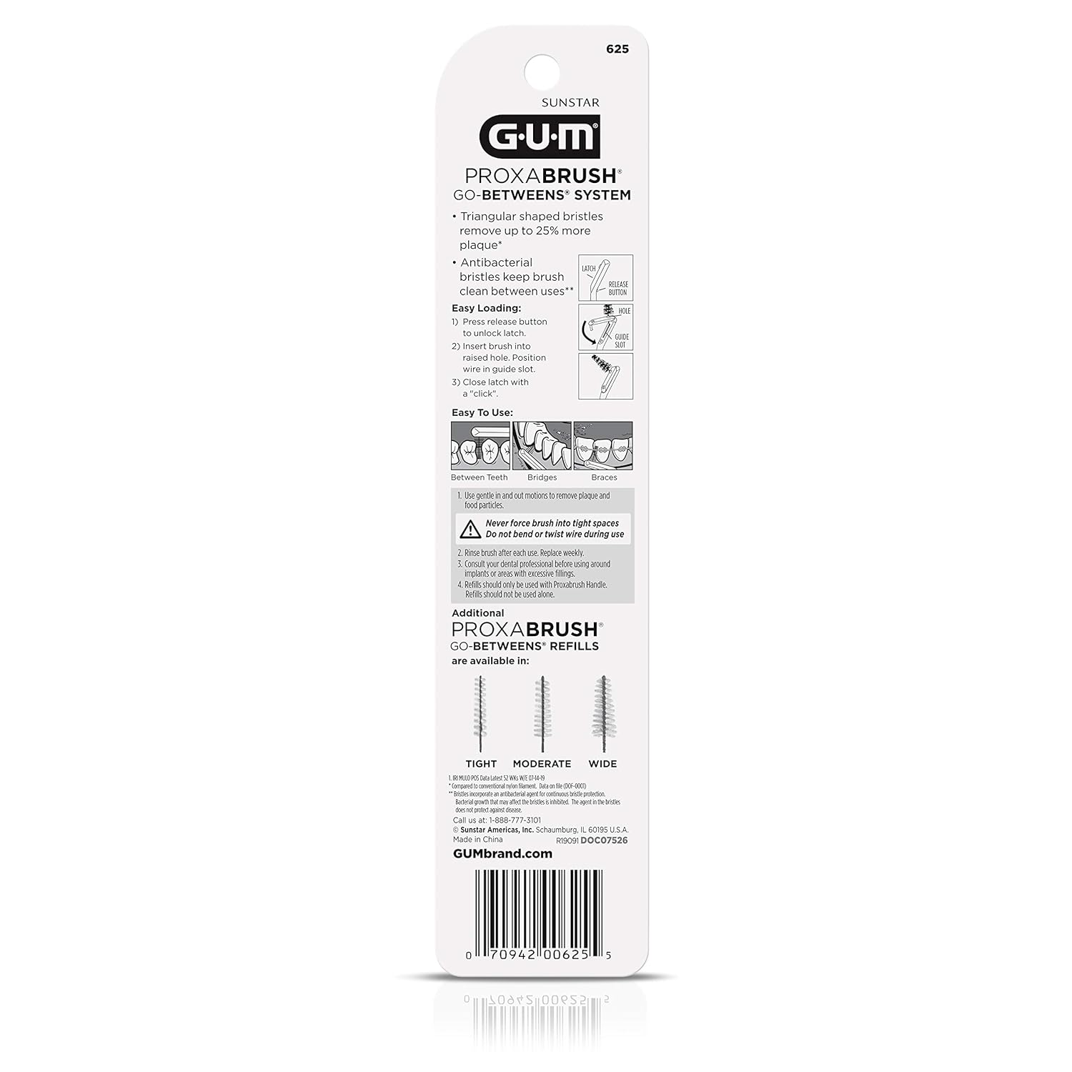 Product Description Go beyond brushing with GUM Proxabrush interdental brushes. Between-teeth cleaning is essential for removing plaque from hard-to-reach areas that are missed by brushing alone.... But tight teeth, difficulty gripping floss, and a simple lack of time prevent many of us from flossing as often as we should. The GUM Proxabrush permanent handle is compatible with all Proxabrush refills. Our permanent handle dental cleaners are clinically designed by dental professionals to offer a quick, easy, and effective alternative to flossing. A long handle and non-slip rubber grip make it easy to clean between teeth - even in hard-to-reach areas. Best of all, a reusable design cuts down on single use plastics for a dental pick that you can feel good about. Proxabrush refill brushes come in three options (Tight, Moderate, and Wide) to accommodate interdental spaces of all shapes and sizes. Each floss brush is suitable for up to 10 days of use and comes with nylon coated wire that cleans around braces, bridges, implants, and other dental devices without the risk of scratching or galvanic shock. Manufacturer Contact Information 1,DEEP CLEANING : GUM Proxabrush Go-Betweens feature soft bristles that slide between the teeth for a deep-cleaning alternative to floss that removes plaque that can't be reached with tooth brushing alone,COMPATIBLE WITH ALL PROXABRUSH REFILLS : The GUM permanent handle is compatible with all GUM Proxabrush Go-Betweens refills. Our floss brush refills are available in 3 sizes : Tight, Moderate, and Wide,COMPAct & REUSABLE : The GUM reusable interdental brush system is the PERFECT way to cut down on single use plastics while removing plaque for healthier gums, cleaner teeth, and fresher breath,PERFECT FOR BRACES & APPLIANCES : Our floss brushes are clinically designed with nylon-coated wire that comfortably cleans around braces, fixtures, implants, and other dental devices without causing scratching or galvanic shock,HEALTHY STARTS HERE : Research continues to show the connection between oral health and overall health. The GUM brand is committed to providing innovative products for between-teeth cleaning to help everyone achieve their healthiest life possible