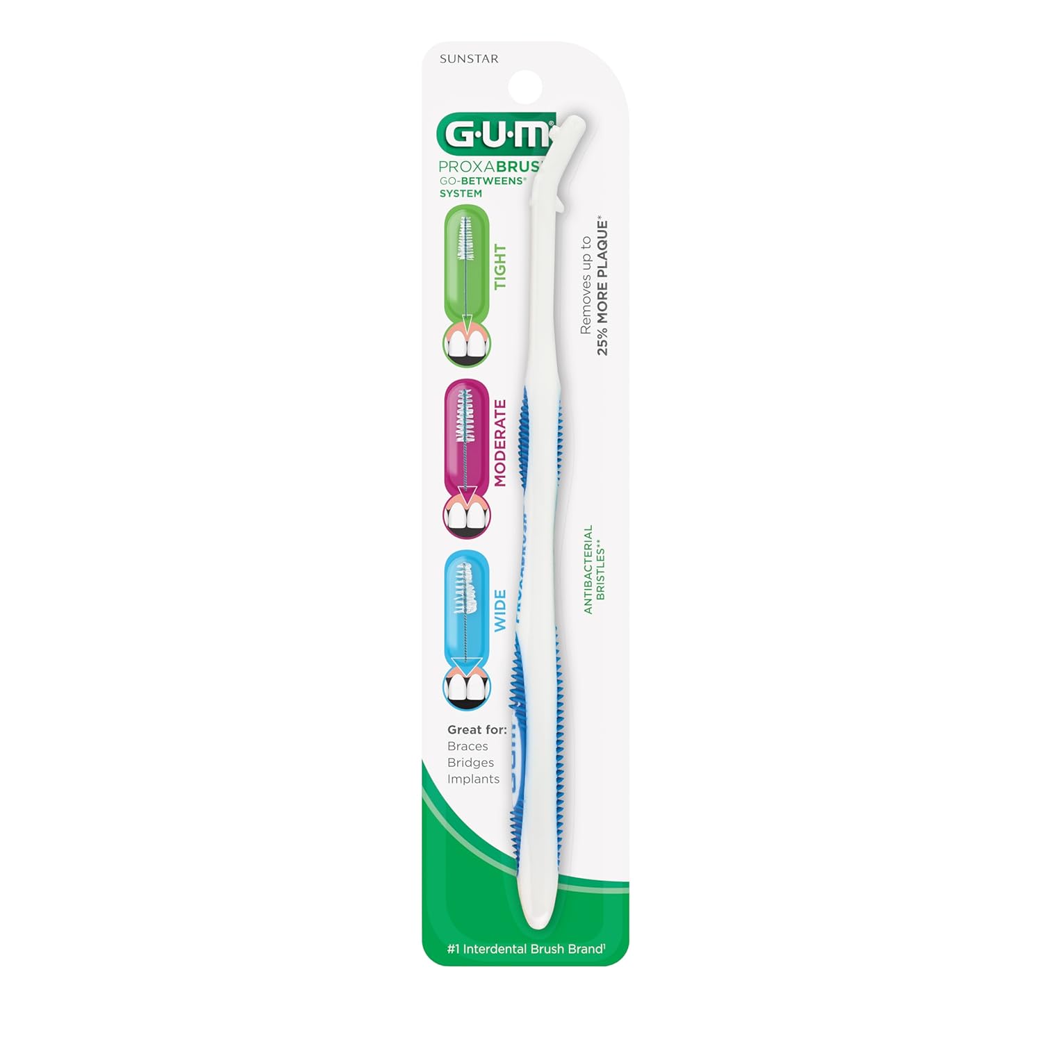Product Description Go beyond brushing with GUM Proxabrush interdental brushes. Between-teeth cleaning is essential for removing plaque from hard-to-reach areas that are missed by brushing alone.... But tight teeth, difficulty gripping floss, and a simple lack of time prevent many of us from flossing as often as we should. The GUM Proxabrush permanent handle is compatible with all Proxabrush refills. Our permanent handle dental cleaners are clinically designed by dental professionals to offer a quick, easy, and effective alternative to flossing. A long handle and non-slip rubber grip make it easy to clean between teeth - even in hard-to-reach areas. Best of all, a reusable design cuts down on single use plastics for a dental pick that you can feel good about. Proxabrush refill brushes come in three options (Tight, Moderate, and Wide) to accommodate interdental spaces of all shapes and sizes. Each floss brush is suitable for up to 10 days of use and comes with nylon coated wire that cleans around braces, bridges, implants, and other dental devices without the risk of scratching or galvanic shock. Manufacturer Contact Information 1-888-777-3101,DEEP CLEANING : GUM Proxabrush Go-Betweens feature soft bristles that slide between the teeth for a deep-cleaning alternative to floss that removes plaque that can't be reached with tooth brushing alone,COMPATIBLE WITH ALL PROXABRUSH REFILLS : The GUM permanent handle is compatible with all GUM Proxabrush Go-Betweens refills. Our floss brush refills are available in 3 sizes : Tight, Moderate, and Wide,COMPACT & REUSABLE : The GUM reusable interdental brush system is the perfect way to cut down on single use plastics while removing plaque for healthier gums, cleaner teeth, and fresher breath,PERFECT FOR BRACES & APPLIANCES : Our floss brushes are clinically designed with nylon-coated wire that comfortably cleans around braces, fixtures, implants, and other dental devices without causing scratching or galvanic shock,HEALTHY STARTS HERE : Research continues to show the connection between oral health and overall health. The GUM brand is committed to providing innovative products for between-teeth cleaning to help everyone achieve their healthiest life possible